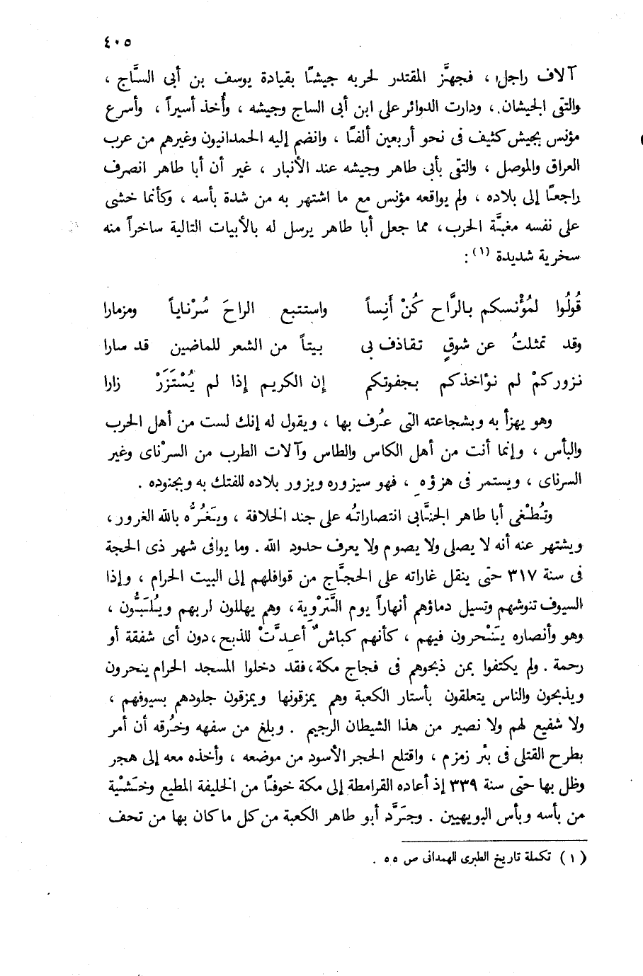 آلاف راجل، فجهّز المقتدر لحربه جيشا بقيادة يوسف بن أبى السّاج، والتقى الجيشان، ودارت الدوائر على ابن أبى الساج وجيشه، وأخذ أسيرا، وأسرع مؤنس بجيش كثيف فى نحو أربعين ألفا، وانضم إليه الحمدانيون وغيرهم من عرب العراق والموصل، والتقى بأبى طاهر وجيشه عند الأنبار، غير أن أبا طاهر انصرف راجعا إلى بلاده، ولم يواقعه مؤنس مع ما اشتهر به من شدة بأسه، وكأنما خشى على نفسه مغبّة الحرب، مما جعل أبا طاهر يرسل له بالأبيات التالية ساخرا منه سخرية شديدة (¬1):