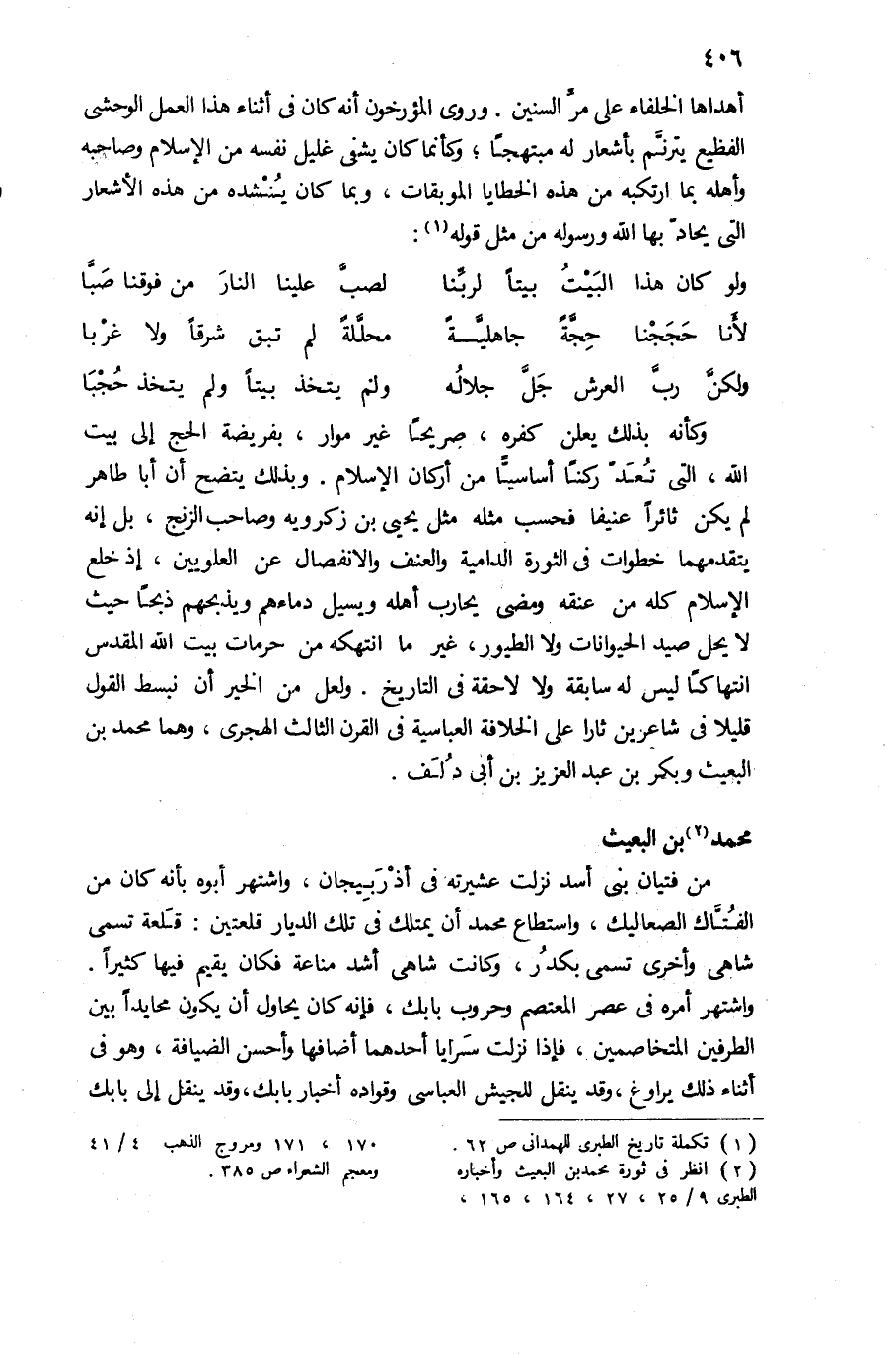 وكأنه بذلك يعلن كفره، صريحا غير موار، بفريضة الحج إلى بيت الله، التى تعدّ ركنا أساسيّا من أركان الإسلام. وبذلك يتضح أن أبا طاهر لم يكن ثائرا عنيفا فحسب مثله مثل يحيى بن زكرويه وصاحب الزنج، بل إنه يتقدمهما خطوات فى الثورة الدامية والعنف والانفصال عن العلويين، إذ خلع الإسلام كله من عنقه ومضى يحارب أهله ويسيل دماءهم ويذبحهم ذبحا حيث لا يحل صيد الحيوانات ولا الطيور، غير ما انتهكه من حرمات بيت الله المقدس انتهاكا ليس له سابقة ولا لاحقة فى التاريخ. ولعل من الخير أن نبسط القول قليلا فى شاعرين ثارا على الخلافة العباسية فى القرن الثالث الهجرى، وهما محمد بن البعيث وبكر بن عبد العزيز بن أبى دلف.