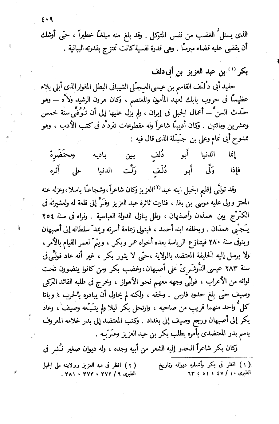 وقد تولّى إقليم الجبل ابنه عبد (¬2) العزيز وكان شاعرا، وشجاعا باسلا، وعزله عنه المعتز وولى عليه موسى بن بغا، فثارت ثائرة عبد العزيز وفرّ إلى قلعة له ولعشيرته فى الكرج بين همذان وأصفهان، وظل ينازل الدولة العباسية. ونراه فى سنة 254 يجبى همذان. ويخلفه ابنه أحمد، فيتولى زعامة أسرته ويمدّ سلطانه إلى أصبهان ويتوفى سنة 280 فيتنازع الرياسة بعده أخواه عمر وبكر، ويتمّ لعمر القيام بالأمر، ولا يرسل إليه الخليفة المعتضد بالولاية، حتى لا يثور بكر، غير أنه عاد فولّى فى سنة 283 عيسى النّوشرى على أصبهان، وغضب بكر ومن كانوا ينضوون تحت لوائه من الأعراب، فولّى وجهه معهم نحو الأهواز، وخرج فى طلبه القائد التركى وصيف حتى بلغ حدود فارس. ولحقه، ولكنه لم يحاول أن يبادره بالحرب، وباتا كلّ واحد منهما قريب من صاحبه، وارتحل بكر ليلا ولم يتبعه وصيف، وعاد بكر إلى أصبهان ورجع وصيف إلى بغداد. وكتب المعتضد إلى بدر غلامه المعروف باسم بدر المعتضدى يأمره بطلب بكر بن عبد العزيز وعربه.