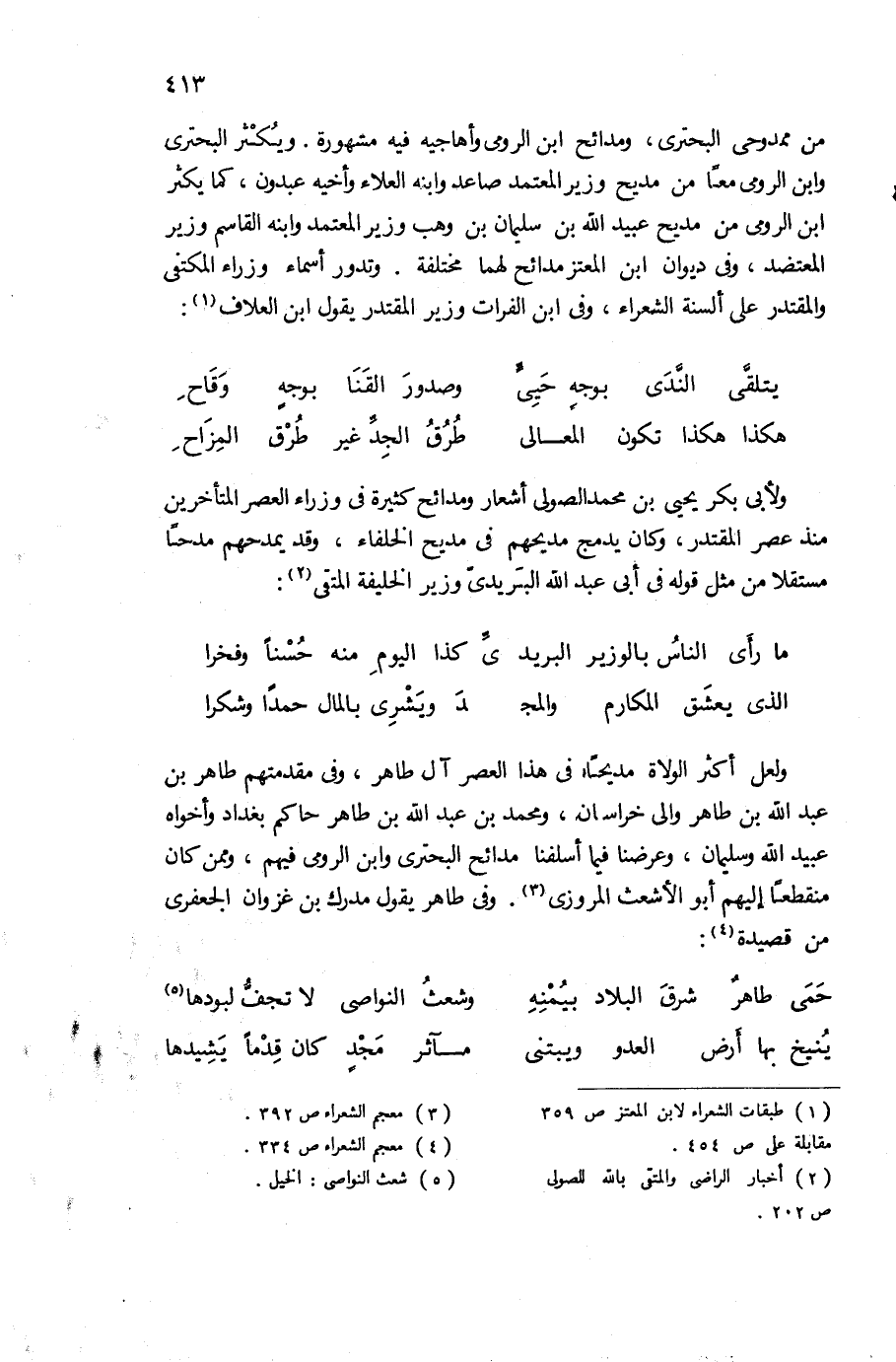من ممدوحى البحترى، ومدائح ابن الرومى وأهاجيه فيه مشهورة. ويكثر البحترى وابن الرومى معا من مديح وزير المعتمد صاعد وابنه العلاء وأخيه عبدون، كما يكثر ابن الرومى من مديح عبيد الله بن سليمان بن وهب وزير المعتمد وابنه القاسم وزير المعتضد، وفى ديوان ابن المعتز مدائح لهما مختلفة. وتدور أسماء وزراء المكتفى والمقتدر على ألسنة الشعراء، وفى ابن الفرات وزير المقتدر يقول ابن العلاف (¬1):