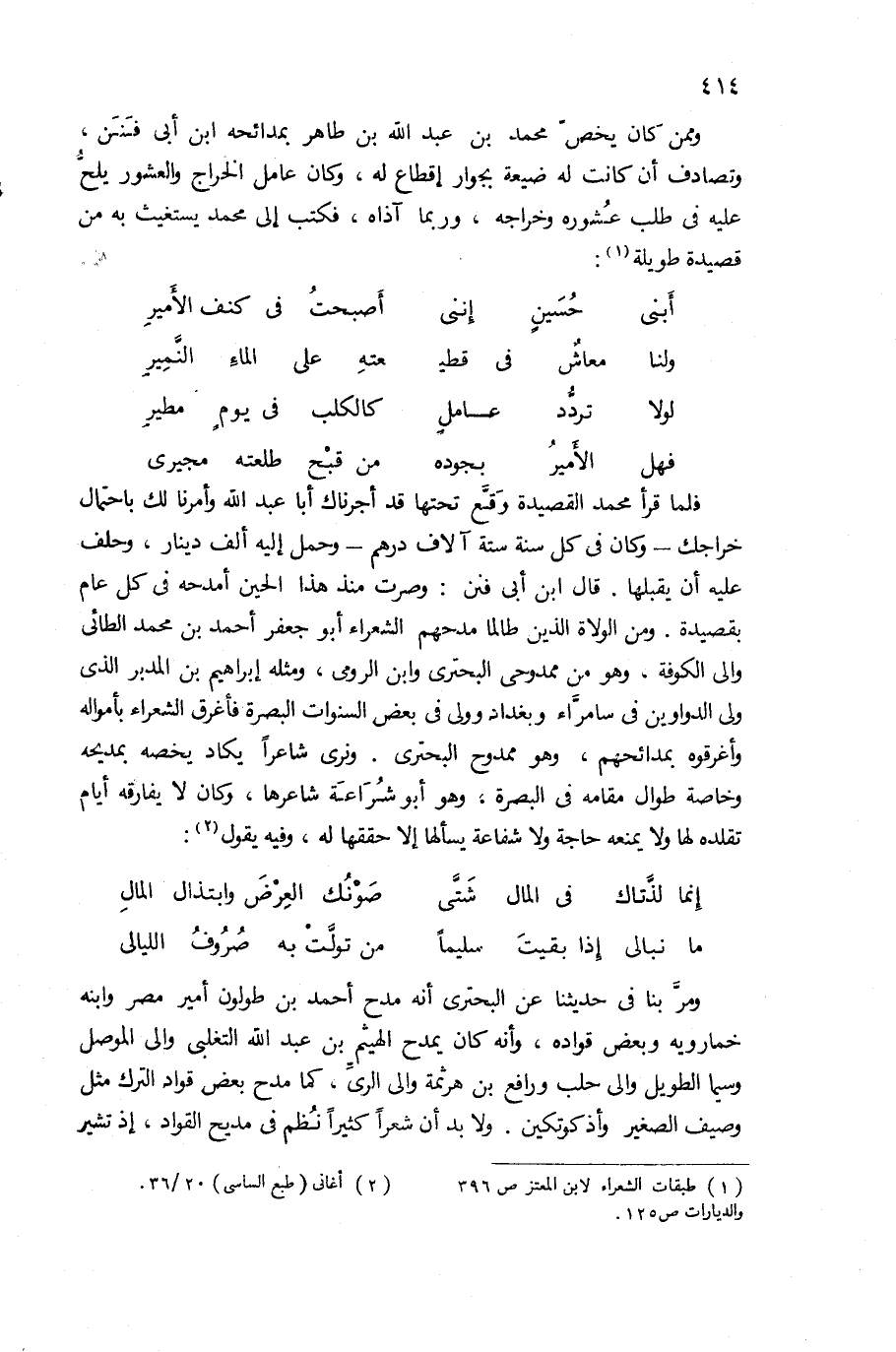 فلما قرأ محمد القصيدة وقّع تحتها قد أجرناك أبا عبد الله وأمرنا لك باحتمال خراجك-وكان فى كل سنة ستة آلاف درهم-وحمل إليه ألف دينار، وحلف عليه أن يقبلها. قال ابن أبى فنن: وصرت منذ هذا الحين أمدحه فى كل عام بقصيدة. ومن الولاة الذين طالما مدحهم الشعراء أبو جعفر أحمد بن محمد الطائى والى الكوفة. وهو من ممدوحى البحترى وابن الرومى، ومثله إبراهيم بن المدبر الذى ولى الدواوين فى سامرّاء وبغداد وولى فى بعض السنوات البصرة فأغرق الشعراء بأمواله وأغرقوه بمدائحهم. وهو ممدوح البحترى. ونرى شاعرا يكاد يخصه بمديحه وخاصة طوال مقامه فى البصرة، وهو أبو شراعة شاعرها، وكان لا يفارقه أيام تفقده؟ ؟ ؟ لها ولا يمنعه حاجة ولا شفاعة يسألها إلا حققها له، وفيه يقول (¬2):