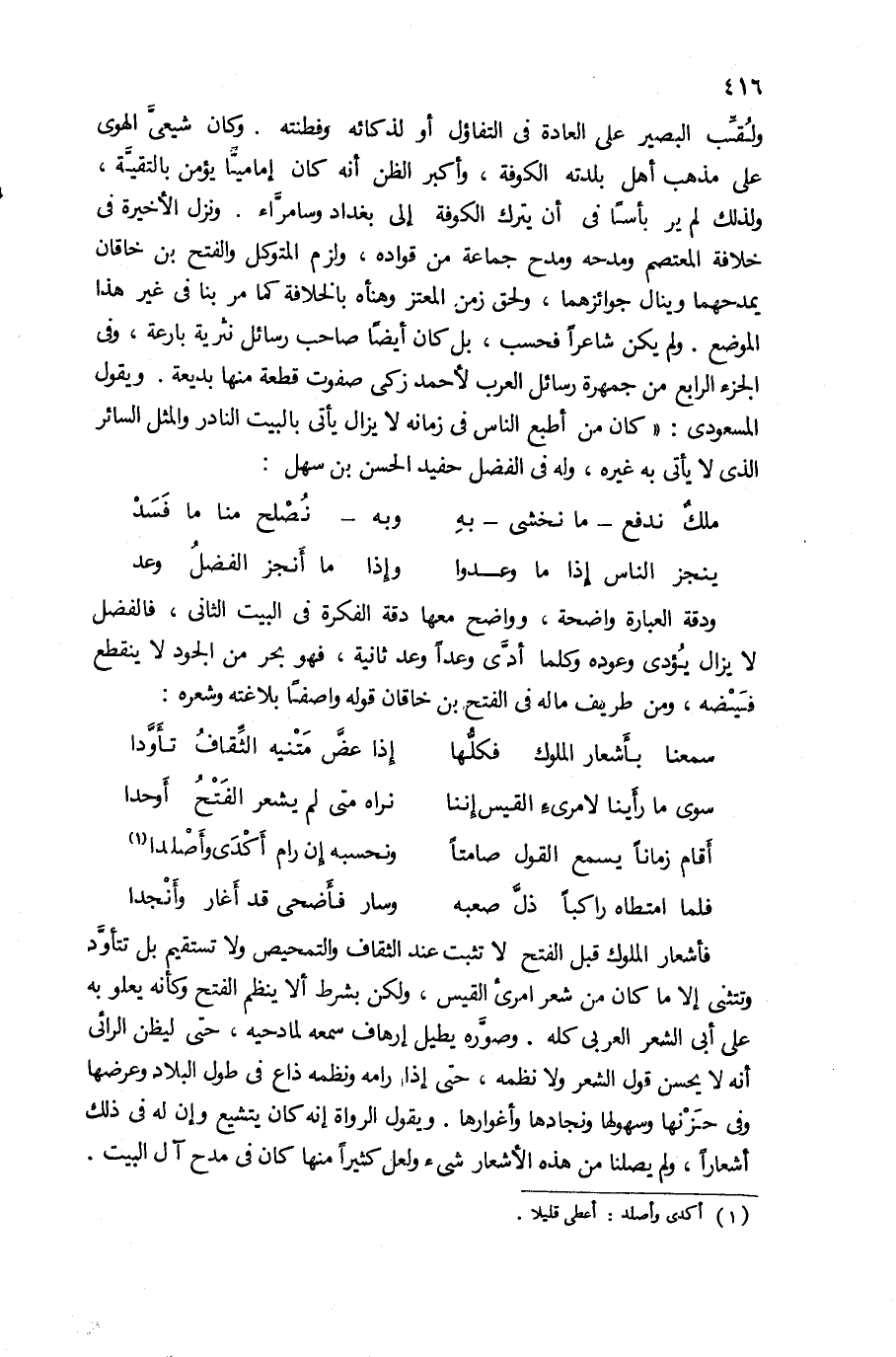فأشعار الملوك قبل الفتح لا تثبت عند الثقاف والتمحيص ولا تستقيم بل تتأوّد وتتثنى إلا ما كان من شعر امرئ القيس، ولكن بشرط ألا ينظم الفتح وكأنه يعلو به على أبى الشعر العربى كله. وصوّره يطيل إرهاف سمعه لمادحيه، حتى ليظن الرائى أنه لا يحسن قول الشعر ولا نظمه، حتى إذا رامه ونظمه ذاع فى طول البلاد وعرضها وفى حزنها وسهولها ونجادها وأغوارها. ويقول الرواة إنه كان يتشيع وإن له فى ذلك أشعارا، ولم يصلنا من هذه الأشعار شئ ولعل كثيرا منها كان فى مدح آل البيت.