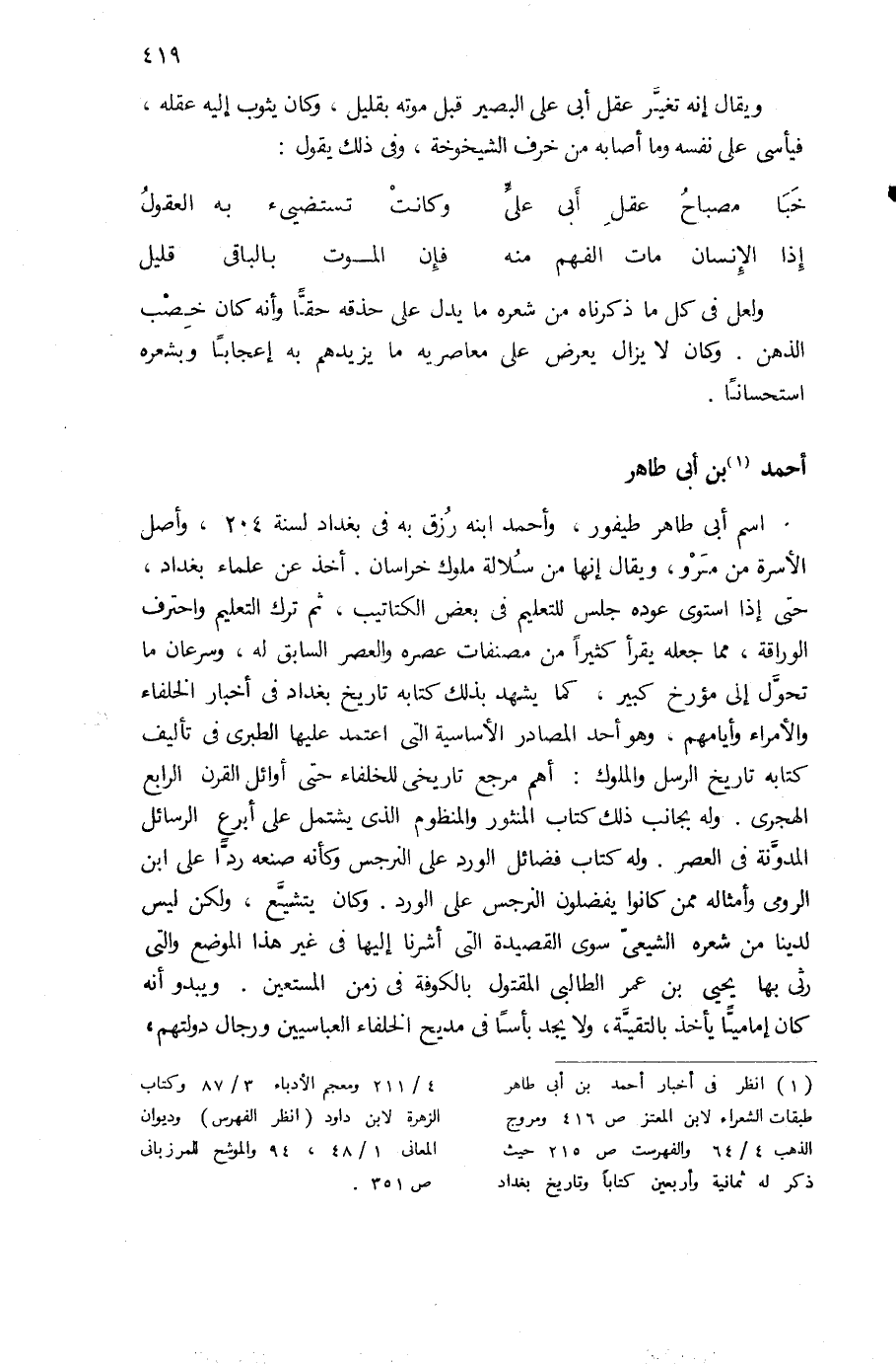 (¬1) انظر فى أخبار أحمد بن أبى طاهر طبقات الشعراء لابن المعتز ص 416 ومروج الذهب 4/ 64 والفهرست ص 215 حيث ذكر له ثمانية وأربعين كتابا وتاريخ بغداد 4/ 211 ومعجم الأدباء 3/ 87 وكتاب الزهرة لابن داود (انظر الفهرس) وديوان المعانى 1/ 48، 94 والموشح للمرزبانى ص 351.
