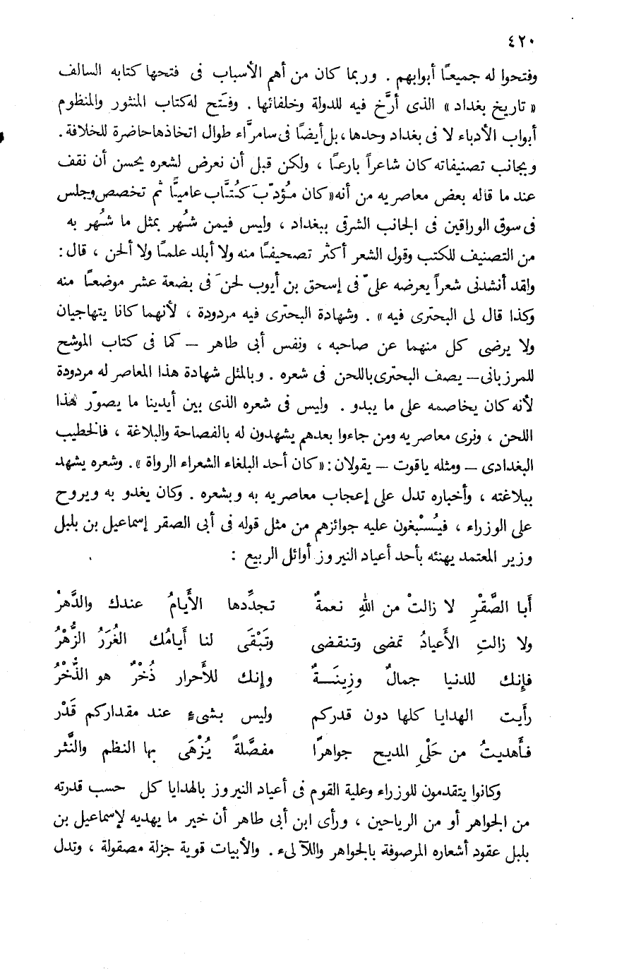 وفتحوا له جميعا أبوابهم. وربما كان من أهم الأسباب فى فتحها كتابه السالف «تاريخ بغداد» الذى أرّخ فيه للدولة وخلفائها. وفتح له كتاب المنثور والمنظوم أبواب الأدباء لا فى بغداد وحدها، بل أيضا فى سامرّاء طوال اتخاذها حاضرة للخلافة.