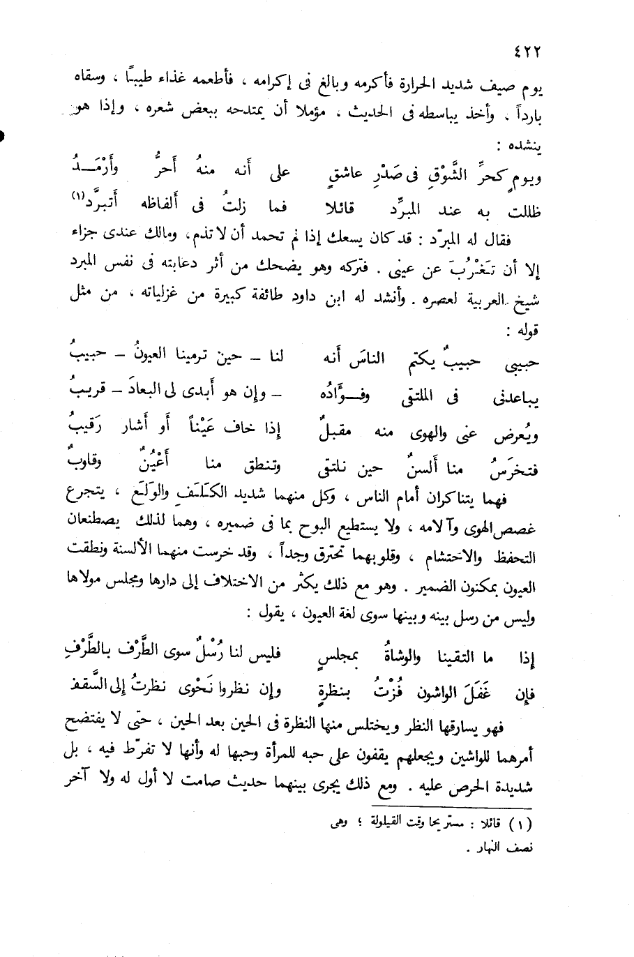 فقال له المبرّد: قد كان يسعك إذا لم تحمد أن لا تذم، ومالك عندى جزاء إلا أن تغرب عن عينى. فتركه وهو يضحك من أثر دعابته فى نفس المبرد شيخ العربية لعصره. وأنشد له ابن داود طائفة كبيرة من غزلياته، من مثل قوله: