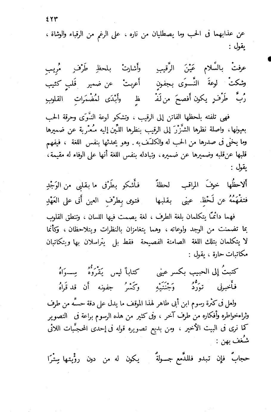 ولعل فى كثرة رسوم ابن أبى طاهر لهذا الموقف ما يدل على دقة حسّه من طرف وثراء خواطره وأفكاره من طرف آخر، وفى كثير من هذه الرسوم براعة فى التصوير كما نرى فى البيت الأخير، ومن بديع تصويره قوله فى إحدى المحجّبات اللائى شغف بهن: