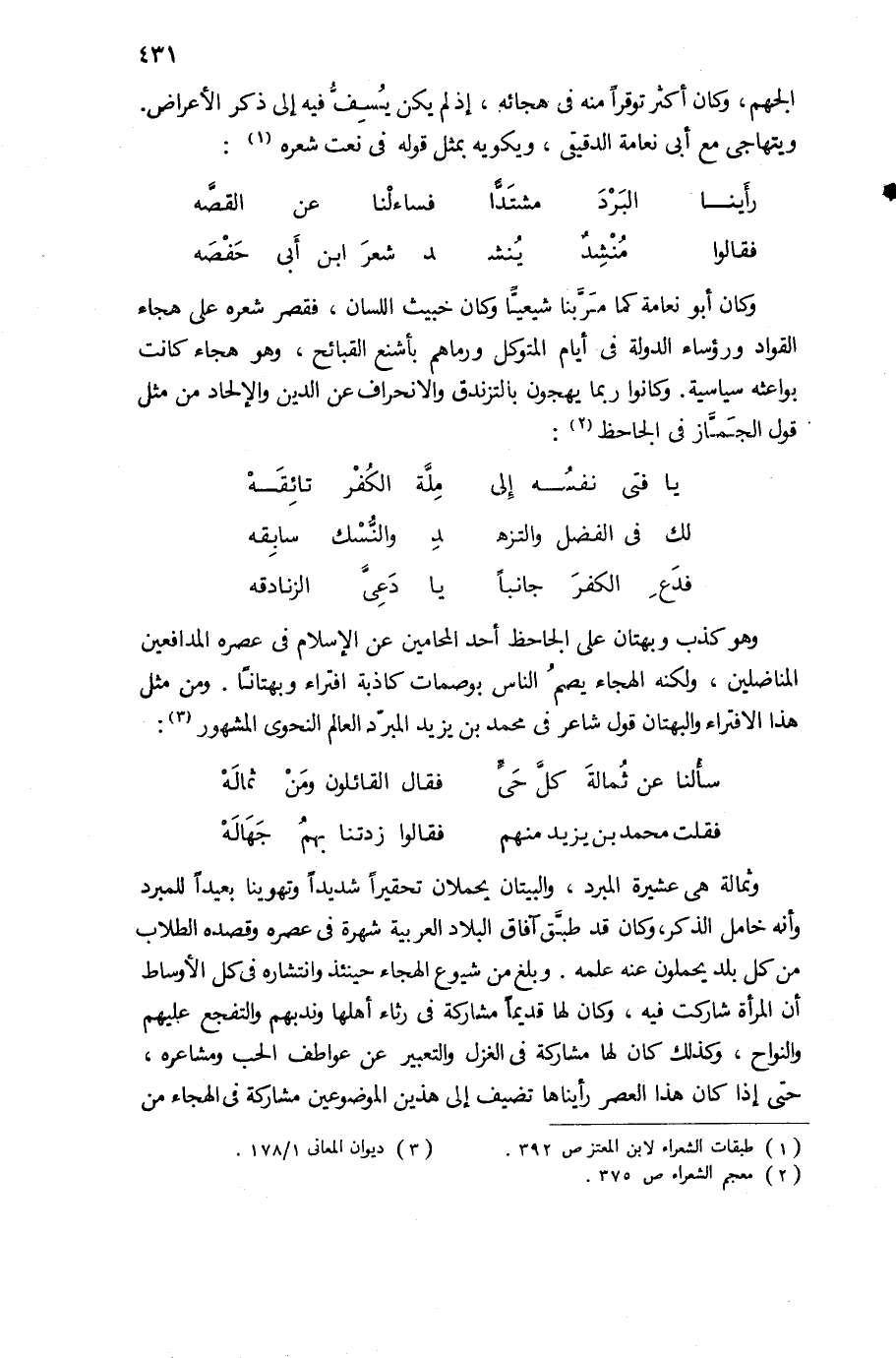 وهو كذب وبهتان على الجاحظ أحد المحامين عن الإسلام فى عصره المدافعين المناضلين، ولكنه الهجاء يصم الناس بوصمات كاذبة افتراء وبهتانا. ومن مثل هذا الافتراء والبهتان قول شاعر فى محمد بن يزيد المبرّد العالم النحوى المشهور (¬3):