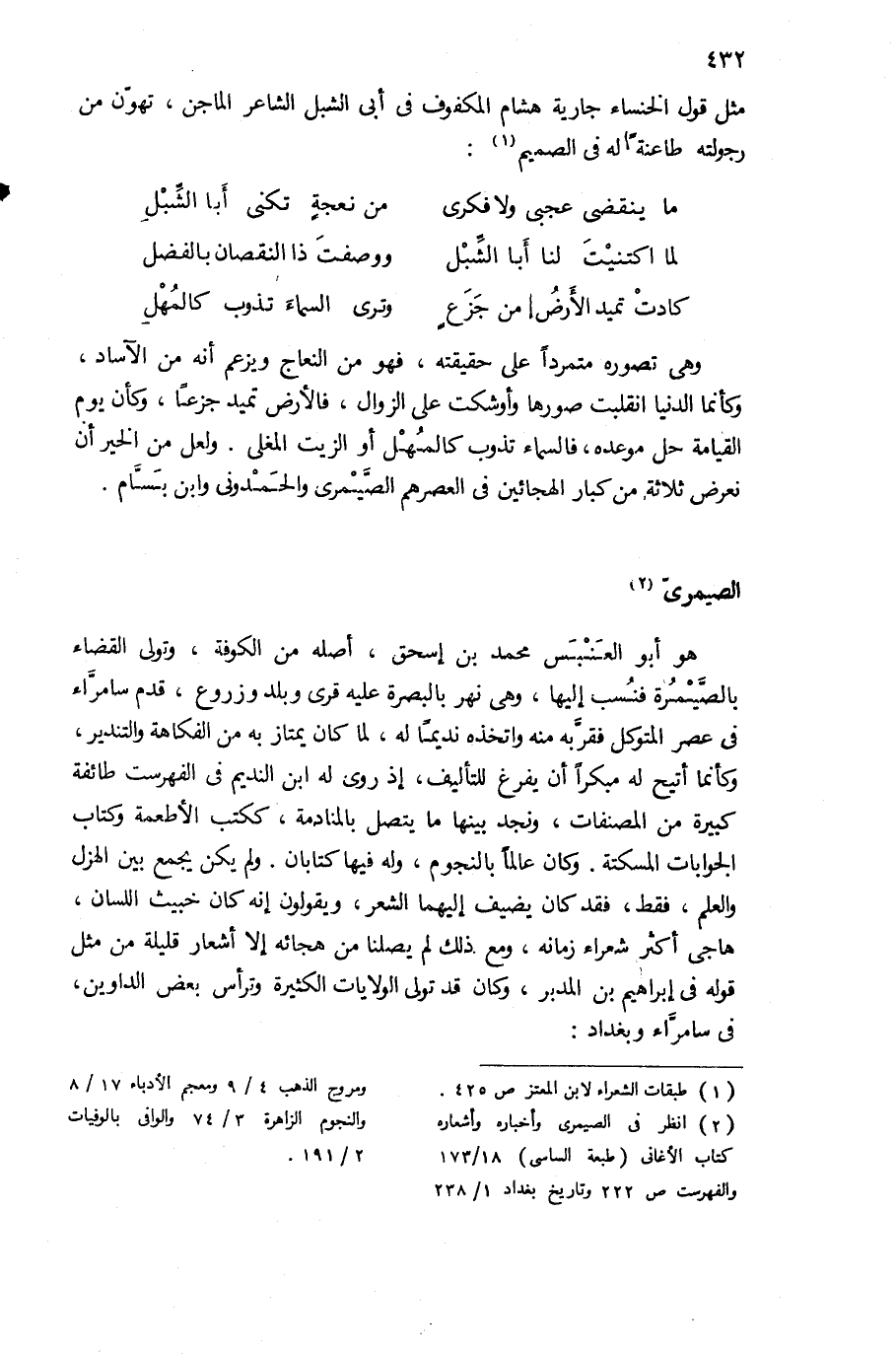 (¬2) انظر فى الصيمرى وأخباره وأشعاره كتاب الأغانى (طبعة الساسى) 18/ 173 والفهرست ص 222 وتاريخ بغداد 1/ 238 ومروج الذهب 4/ 9 ومعجم الأدباء 17/ 8 والنجوم الزاهرة 3/ 74 والوافى بالوفيات 2/ 191.