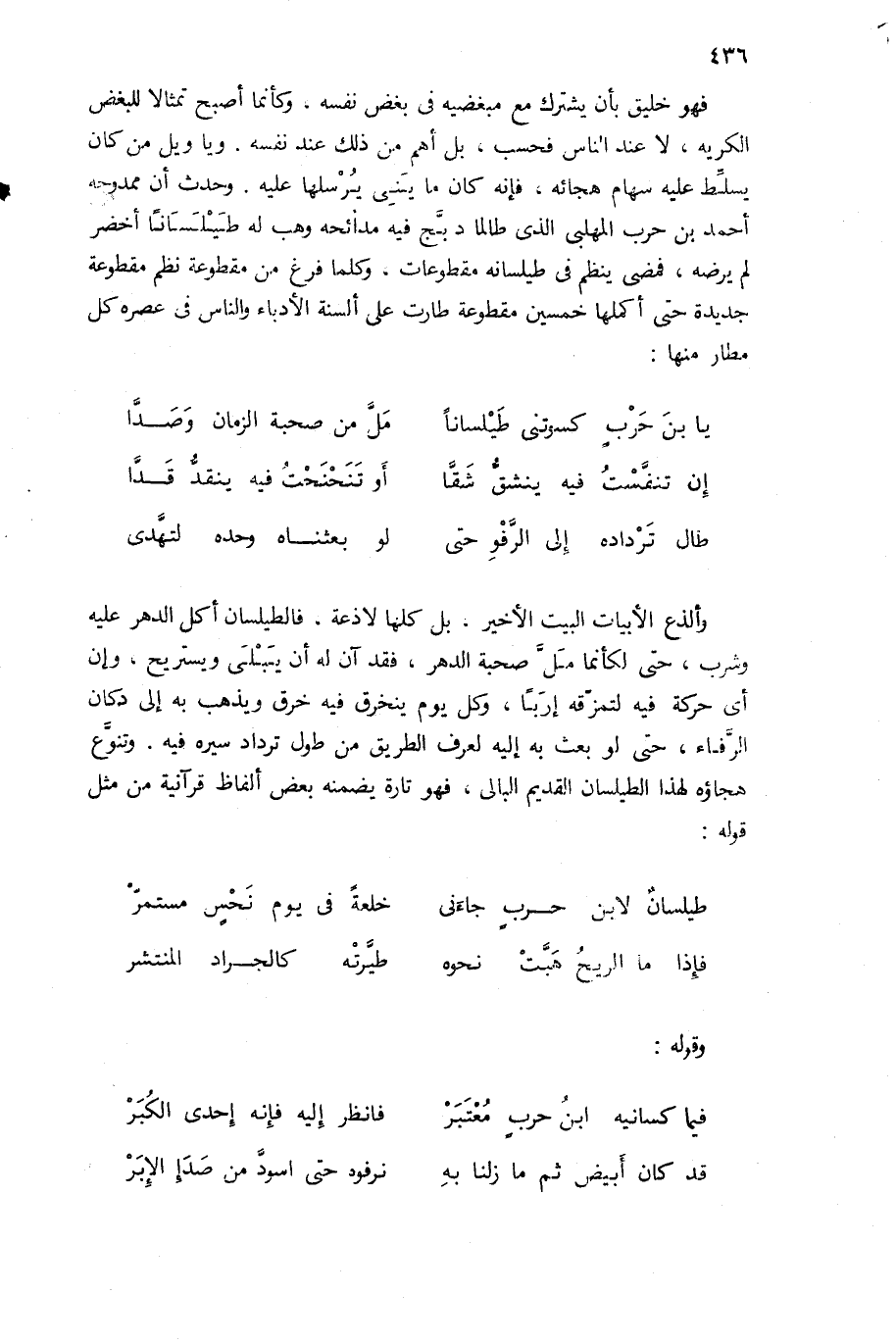 فهو خليق بأن يشترك مع مبغضيه فى بغض نفسه، وكأنما أصبح تمثالا للبغض الكريه، لا عند الناس فحسب، بل أهم من ذلك عند نفسه. ويا ويل من كان يسلّط عليه سهام هجائه. فإنه كان ما ينى يرسلها عليه. وحدث أن ممدوحه أحمد بن حرب المهلبى الذى طالما دبّج فيه مدائحه وهب له طيلسانا أخضر لم يرضه، فمضى ينظم فى طيلسانه مقطوعات. وكلما فرغ من مقطوعة نظم مقطوعة جديدة حتى أكملها خمسين مقطوعة طارت على ألسنة الأدباء والناس فى عصره كل مطار منها: