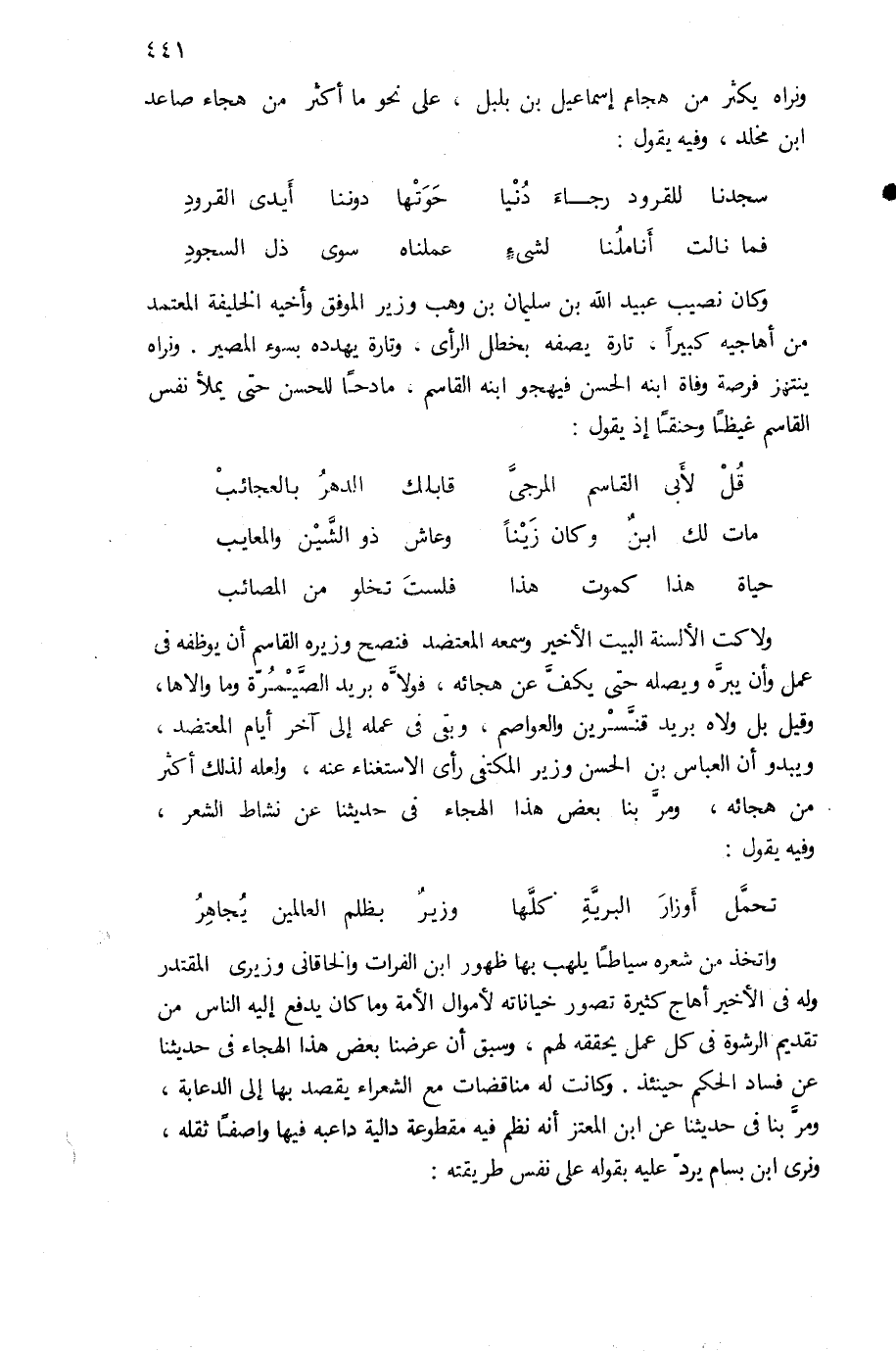 ونراه يكثر من هجام إسماعيل بن بلبل، على نحو ما أكثر من هجاء صاعد ابن مخلد، وفيه يقول: