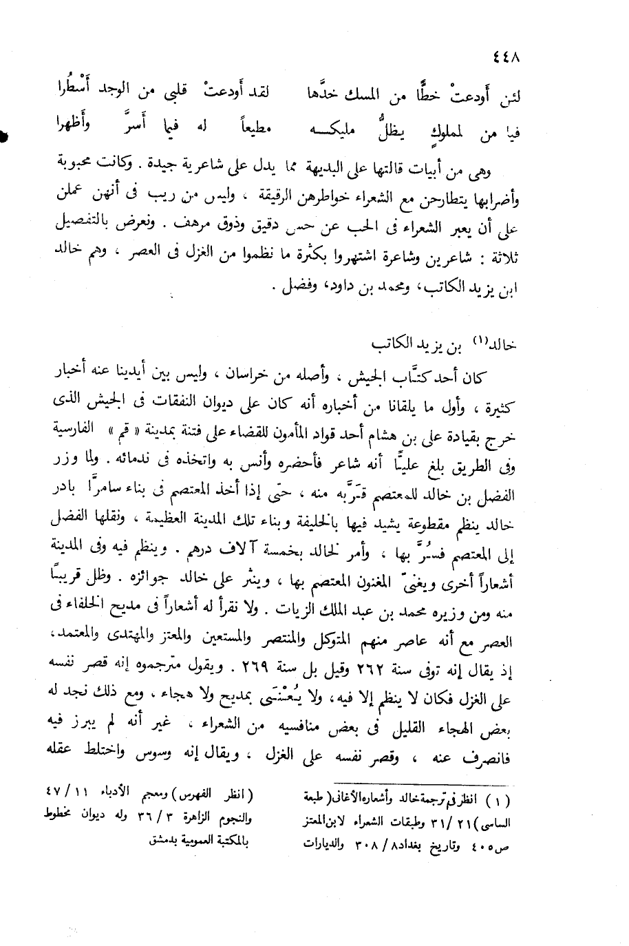 (¬1) انظر فى ترجمة خالد وأشعاره الأغانى (طبعة الساسى) 21/ 31 وطبقات الشعراء لابن المعتز ص 405 وتاريخ بغداد 8/ 308 والديارات (انظر الفهرس) ومعجم الأدباء 11/ 47 والنجوم الزاهرة 3/ 36 وله ديوان مخطوط بالمكتبة العمومية بدمشق