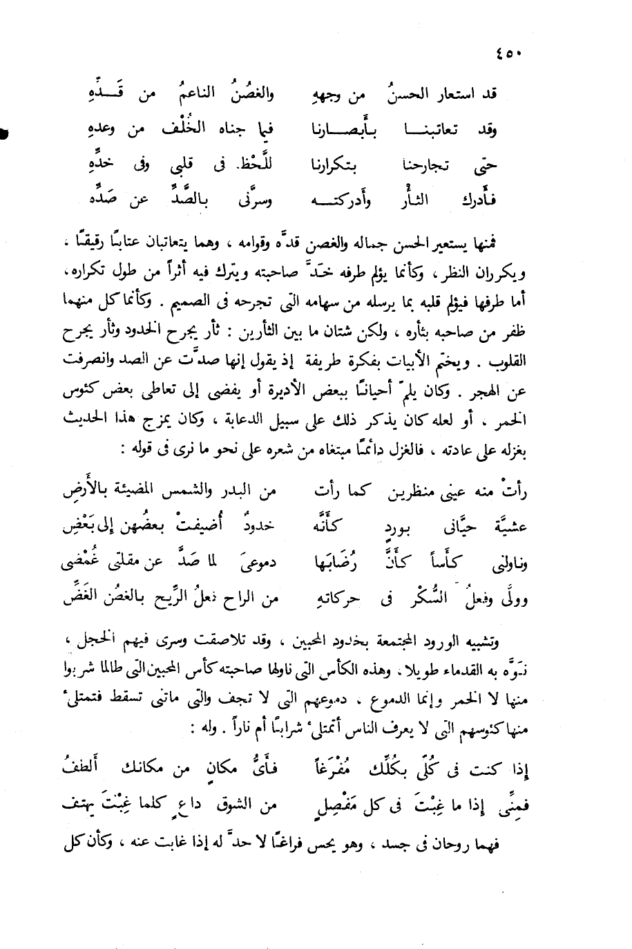 فمنها يستعير الحسن جماله والغصن قدّه وقوامه، وهما يتعاتبان عتابا رقيقا، ويكرران النظر، وكأنما يؤلم طرفه خدّ صاحبته ويترك فيه أثرا من طول تكراره أما طرفها فيؤلم قلبه بما يرسله من سهامه التى تجرحه فى الصميم. وكأنما كل منهما ظفر من صاحبه بثأره. ولكن شتان ما بين الثأرين: ثأر يجرح الخدود وثأر يجرح القلوب. ويختم الأبيات بفكرة طريفة إذ يقول إنها صدّت عن الصد وانصرفت عن الهجر. وكان يلمّ أحيانا ببعض الأديرة أو يفضى إلى تعاطى بعض كئوس الخمر، أو لعله كان يذكر ذلك على سبيل الدعابة، وكان يمزج هذا الحديث بغزله على عادته، فالغزل دائما مبتغاه من شعره على نحو ما نرى فى قوله: