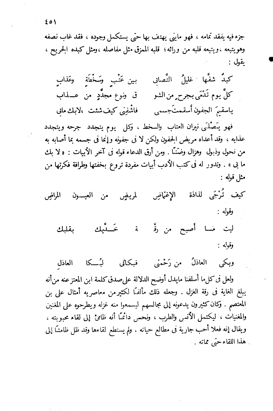 فهو يصلى نيران العتاب والسخط، وكل يوم يتجدد جرحه ويتجدد عذابه، وقد أعداه مريض الجفون ولكن لا فى جفونه وإنما فى جسمه بما أصابه به من نحول وذبول وهزال وضنا. ومن أرق الدعاء قوله فى آخر الأبيات: «لا بك ما بى». وتدور له فى كتب الأدب أبيات مفردة تروع بخفتها وطرافة فكرتها من مثل قوله: