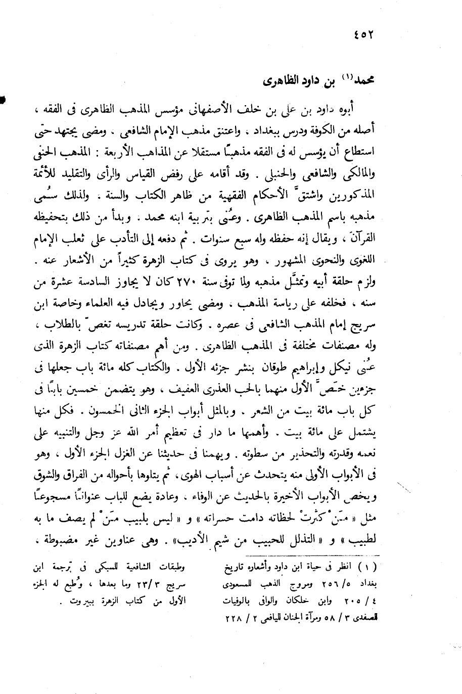(¬1) انظر فى حياة ابن داود وأشعاره تاريخ بغداد 5/ 256 ومروج الذهب للمسعودى 4/ 205 وابن خلكان والوافى بالوفيات للصفدى 3/ 58 ومرآة الجنان لليافعى 2/ 228 وطبقات الشافعية للسبكى فى ترجمة ابن سريج 3/ 23 وما بعدها، وطبع له الجزء الأول من كتاب النزهة بيروت.