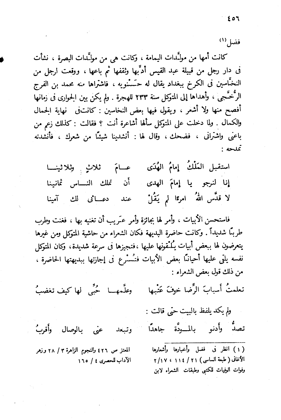 (¬1) انظر فى فضل وأخبارها وأشعارها الأغانى (طبعة الساسى) 21/ 114، 17/ 2 وفوات الوفيات للكتبى وطبقات الشعراء لابن المعتز ص 426 والنجوم الزاهرة 3/ 28 وزهر الآداب للحصرى 4/ 165