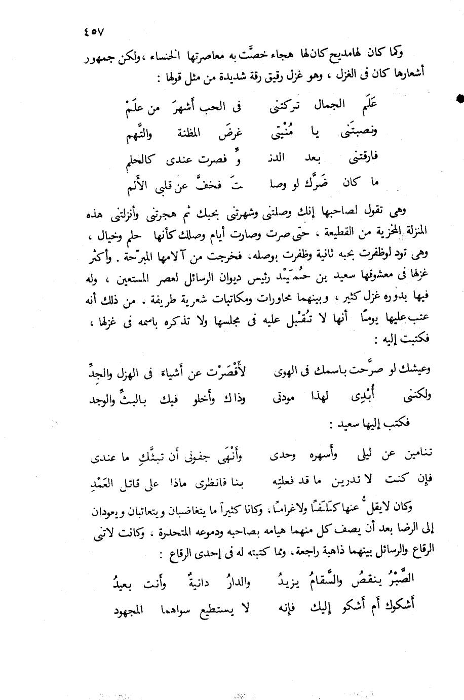 وهى تقول لصاحبها إنك وصلتنى وشهرتنى بحبك ثم هجرتنى وأنزلتنى هذه المنزلة المخزية من القطيعة، حتى صرت وصارت أيام وصلك كأنها حلم وخيال، وهى تود لو ظفرت بحبه ثانية وظفرت بوصله، فخرجت من آلامها المبرّحة. وأكثر غزلها فى معشوقها سعيد بن حميد رئيس ديوان الرسائل لعصر المستعين، وله فيها بدوره غزل كثير، وبينهما محاورات ومكاتبات شعرية طريفة، من ذلك أنه عتب عليها يوما أنها لا تقبل عليه فى مجلسها ولا تذكره باسمه فى غزلها، فكتبت إليه: