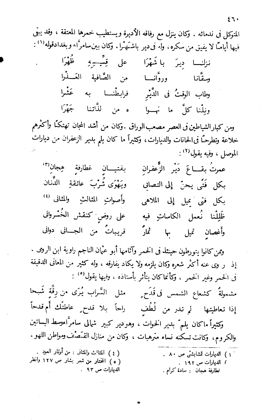 المتوكل فى ندمائه. وكان ينزل مع رفاقه الأديرة ويستطيب خمرها المعتقة، وقد يبقى فيها أياما لا يفيق من سكره، وله فى دير باشهرا، وكان بين سامرّاء وبغداد قوله (¬1):