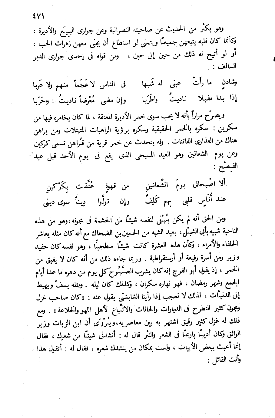 ويصرّح مرارا بأنه لا يحب سوى خمر الأديرة المعتقة، لما كان يخامره فيها من سكرين: سكره بالخمر الحقيقية وسكره برؤية الراهبات المتبتلات ومن يراهن هناك من العذارى الفاتنات. وله يتحدث عن خمر قرية من قراهن تسمى كركين وعن يوم الشعانين وهو العيد المسيحى الذى يقع فى يوم الأحد قبل عيد الفصح: