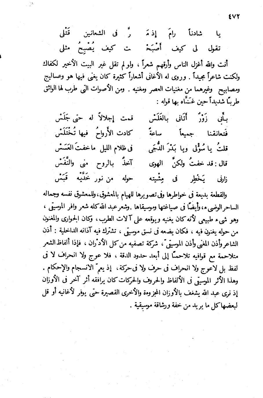 والقطعة بديعة فى خواطرها وفى تصويرها للهيام بالمعشوق، وللمعشوق نفسه وجماله الساحر الوضئ، وأيضا فى صياغتها وموسيقاها. وشعر عبد الله كله شعر وافر الموسيقى، وهو شئ طبيعى لأنه كان يغنيه ويوقعه على آلات الطرب، وكان الجوارى والمغنون من حوله يغنون فيه، فكان يضعه فى نسق موسيقى، تشترك فيه آذانه الداخلية: أذن الشاعر وأذن المغنى وأذن الموسيقىّ، شركة تصفيه من كل الأدران، فإذا ألفاظ الشعر متلاحمة مع قوافيه تلاحما إلى أبعد حدود الدقة، فلا عوج ولا انحراف لا فى لفظ بل لا عوج ولا انحراف فى حرف ولا فى حركة، إذ يعمّ الانسجام والإحكام.