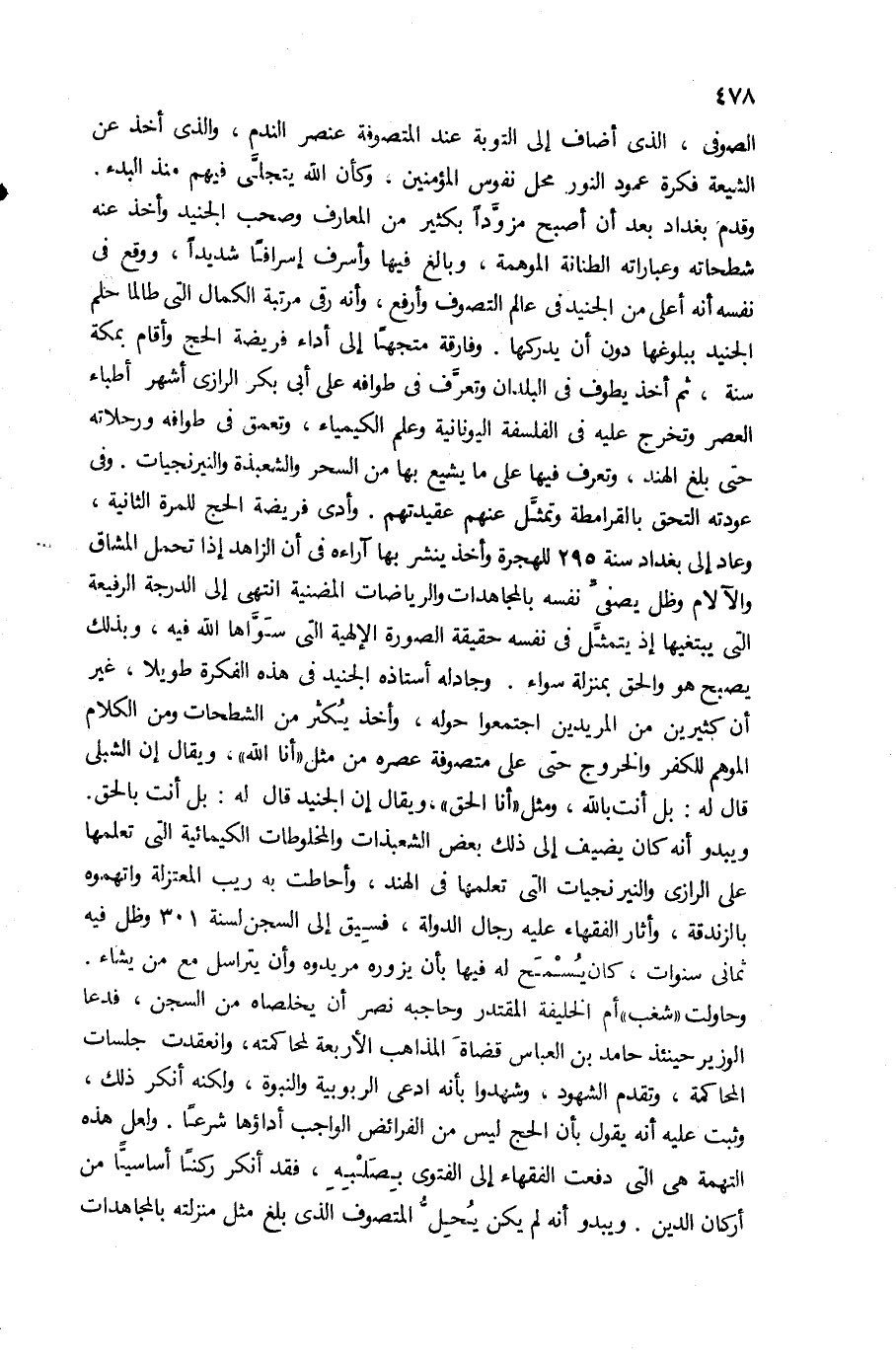وقدم بغداد بعد أن أصبح مزوّدا بكثير من المعارف وصحب الجنيد وأخذ عنه شطحاته وعباراته الطنانة الموهمة، وبالغ فيها وأسرف إسرافا شديدا، ووقع فى نفسه أنه أعلى من الجنيد فى عالم التصوف وأرفع، وأنه رقى مرتبة الكمال التى طالما حلم الجنيد ببلوغها دون أن يدركها. وفارقة متجها إلى أداء فريضة الحج وأقام بمكة سنة، ثم أخذ يطوف فى البلدان وتعرّف فى طوافه على أبى بكر الرازى أشهر أطباء العصر وتخرج عليه فى الفلسفة اليونانية وعلم الكيمياء، وتعمق فى طوافه ورحلاته حتى بلغ الهند، وتعرف فيها على ما يشيع بها من السحر والشعبذة والنيرنجيات. وفى عودته التحق بالقرامطة وتمثّل عنهم عقيدتهم. وأدى فريضة الحج للمرة الثانية، وعاد إلى بغداد سنة 295 للهجرة وأخذ ينشر بها آراءه فى أن الزاهد إذا تحمل المشاق والآلام وظل يصفىّ نفسه بالمجاهدات والرياضات المضنية انتهى إلى الدرجة الرفيعة التى يبتغيها إذ يتمثّل فى نفسه حقيقة الصورة الإلهية التى سوّاها الله فيه، وبذلك يصبح هو والحق بمنزلة سواء. وجادله أستاذه الجنيد فى هذه الفكرة طويلا، غير أن كثيرين من المريدين اجتمعوا حوله، وأخذ يكثر من الشطحات ومن الكلام الموهم للكفر والخروج حتى على متصوفة عصره من مثل «أنا الله»، ويقال إن الشبلى قال له: بل أنت بالله، ومثل «أنا الحق»، ويقال إن الجنيد قال له: بل أنت بالحق.