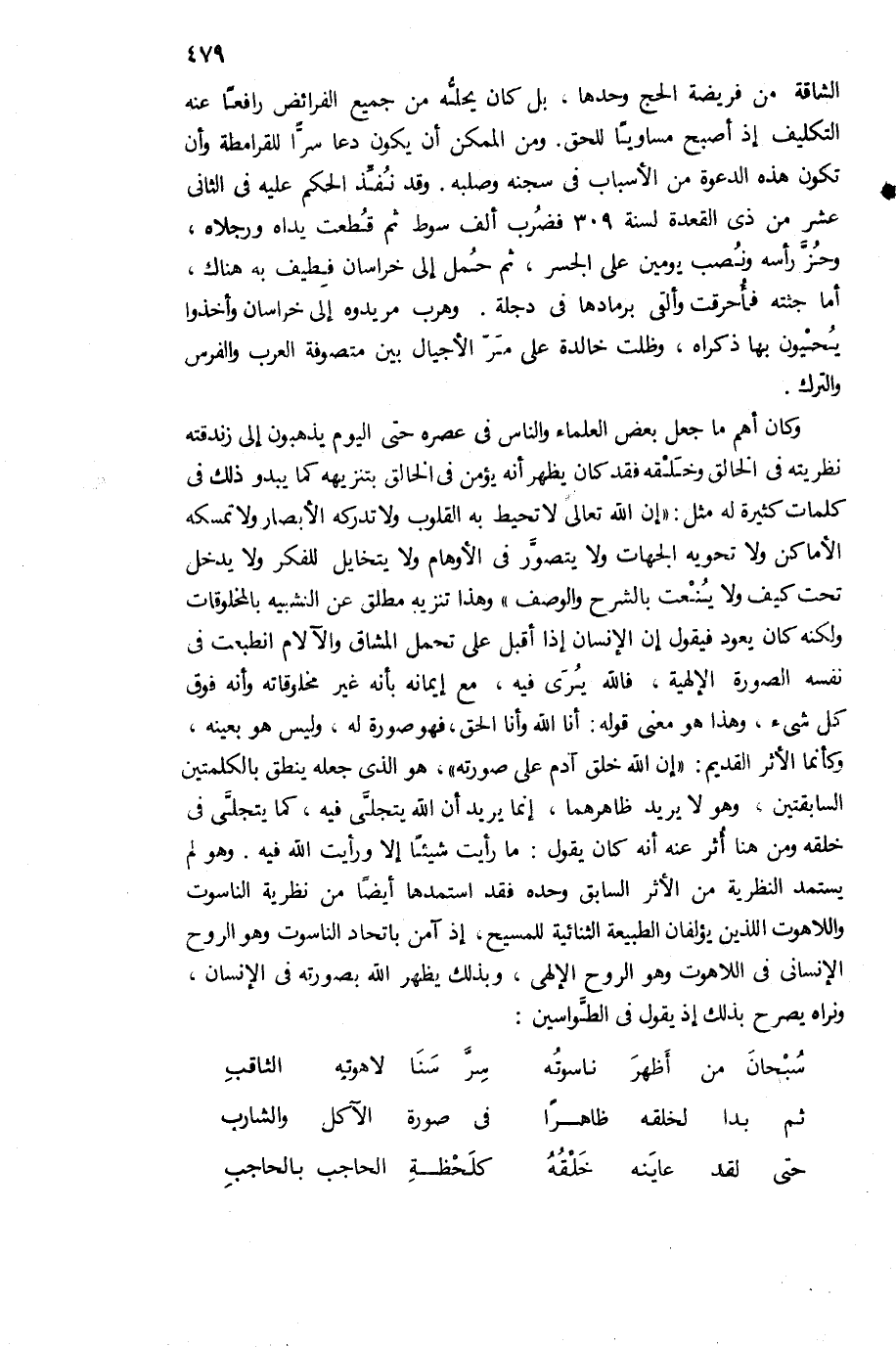 الشاقة من فريضة الحج وحدها، بل كان يحلّه من جميع الفرائض رافعا عنه التكليف إذ أصبح مساويا للحق. ومن الممكن أن يكون دعا سرّا للقرامطة وأن تكون هذه الدعوة من الأسباب فى سجنه وصلبه. وقد نفّذ الحكم عليه فى الثانى عشر من ذى القعدة لسنة 309 فضرب ألف سوط ثم قطعت يداه ورجلاه، وحزّ رأسه ونصب يومين على الجسر، ثم حمل إلى خراسان فطيف به هناك، أما جثته فأحرقت وألقى برمادها فى دجلة. وهرب مريدوه إلى خراسان وأخذوا يحيون بها ذكراه، وظلت خالدة على مرّ الأجيال بين متصوفة العرب والفرس والترك.