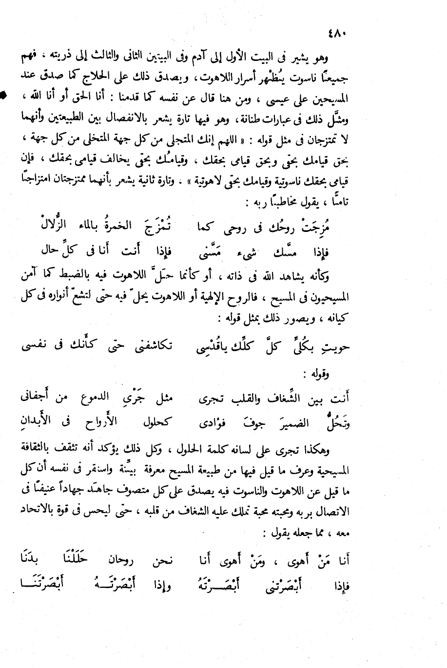 وهو يشير فى البيت الأول إلى آدم وفى البيتين الثانى والثالث إلى ذريته، فهم جميعا ناسوت يظهر أسرار اللاهوت، ويصدق ذلك على الحلاج كما صدق عند المسيحين على عيسى، ومن هنا قال عن نفسه كما قدمنا: أنا الحق أو أنا الله، ومثّل ذلك فى عبارات طنانة، وهو فيها تارة يشعر بالانفصال بين الطبيعتين وأنهما لا تمتزجان فى مثل قوله: «اللهم إنك المتجلى من كل جهة المتخلى من كل جهة، بحق قيامك بحقى وبحق قيامى بحقك، وقيامك بحقى يخالف قيامى بحقك، فإن قيامى بحقك ناسوتية وقيامك بحقى لاهوتية»، وتارة ثانية يشعر بأنهما ممتزجتان امتزاجا تامّا؛ يقول مخاطبا ربه: