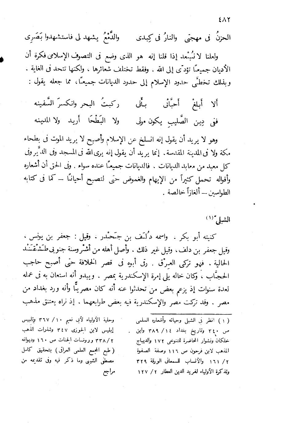 (¬1) انظر فى الشبلى وحياته وأشعاره السلمى ص 340 وتاريخ بغداد 14/ 389 وابن خلكان ونشوار المحاضرة للتنوخى 172 والديباج المذهب لابن فرحون ص 116 وصفة الصفوة 2/ 161 والأنساب للسمعانى الورقة 329 وتذكرة الأولياء لفريد الدين العطار 2/ 127 وحلية الأولياء لأبى نعيم 10/ 367 وتلبيس إبليس لابن الجوزى 347 وشذرات الذهب 2/ 338 وروضات الجنات ص 160 وديوانه (طبع المجمع العلمى العراق) بتحقيق كامل مصطفى الشيبى وما ذكر فيه وفى تقديمه من مراجع