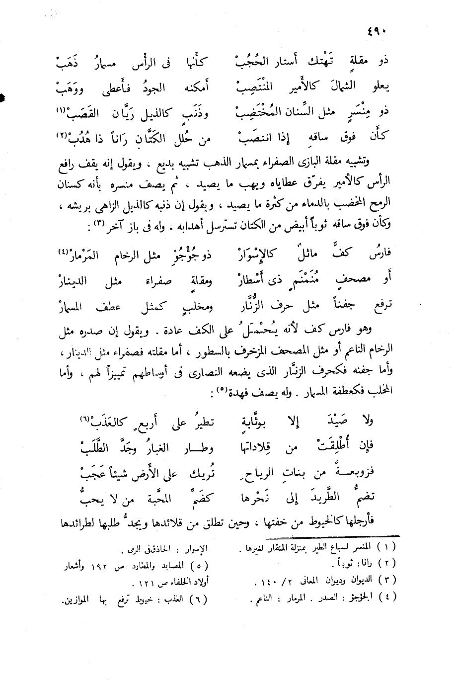 وتشبيه مقلة البازى الصفراء بمسمار الذهب تشبيه بديع، ويقول إنه يقف رافع الرأس كالأمير يفرّق عطاياه ويهب ما يصيد، ثم يصف منسره بأنه كسنان الرمح المخضب بالدماء من كثرة ما يصيد، ويقول إن ذنبه كالذيل الزاهى بريشه، وكأن فوق ساقه ثوبا أبيض من الكتان تسترسل أهدابه، وله فى باز آخر (¬3):