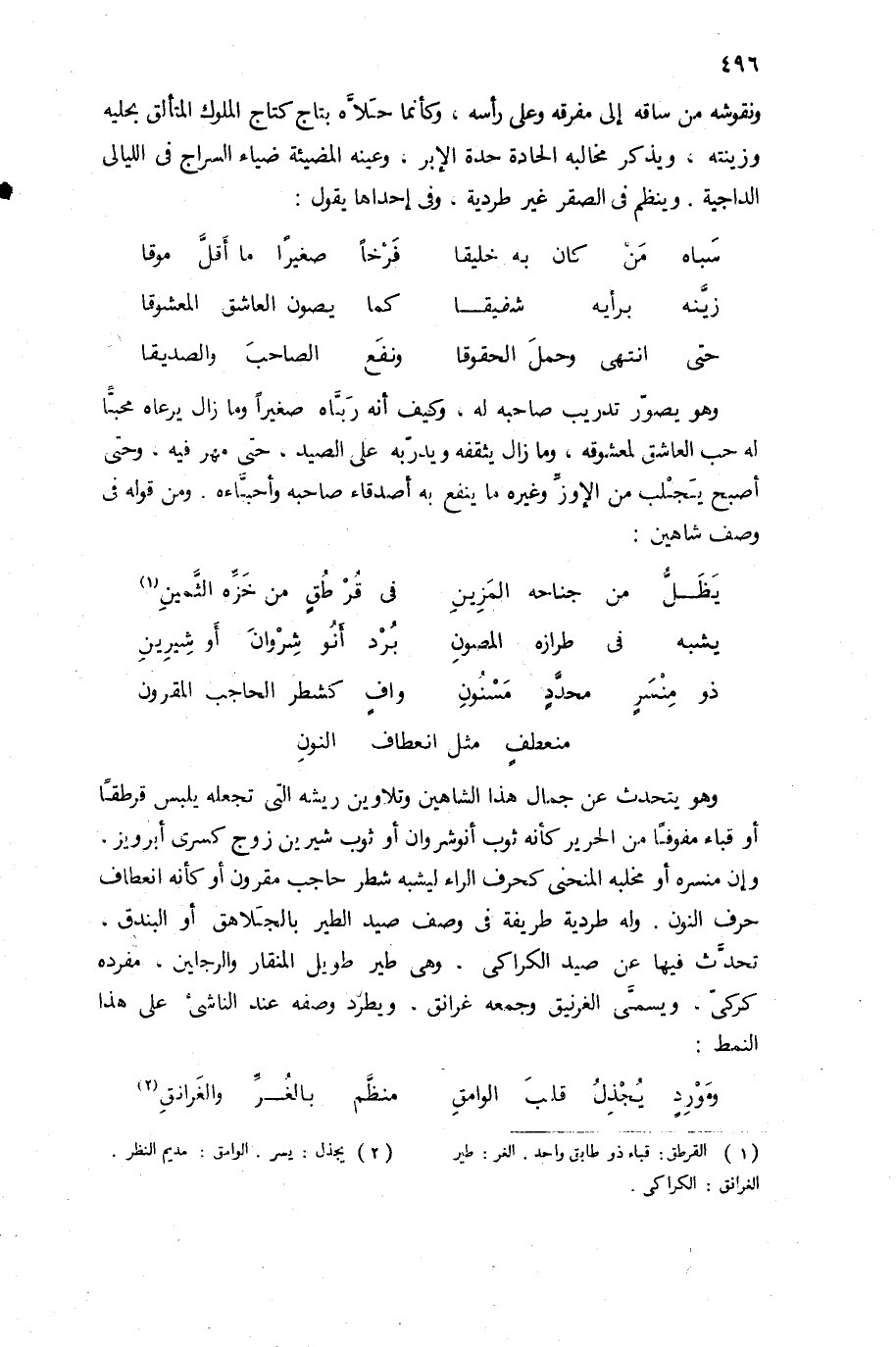 هو يتحدث عن جمال هذا الشاهين وتلاوين ريشه التى تجعله يلبس قرطقا أو قباء مفوفا من الحرير كأنه ثوب أنوشروان أو ثوب شيرين زوج كسرى أبرويز، وإن منسره أو مخلبه المنحنى كحرف الراء ليشبه شطر حاجب مقرون أو كأنه انعطاف حرف النون. وله طردية طريفة فى وصف صيد الطير بالجلاهق أو البندق، تحدّث فيها عن صيد الكراكى، وهى طير طويل المنقار والرجلين، مفرده كركىّ، ويسمّى الغرنيق وجمعه غرانق، ويطرد وصفه عند الناشئ على هذا النمط: