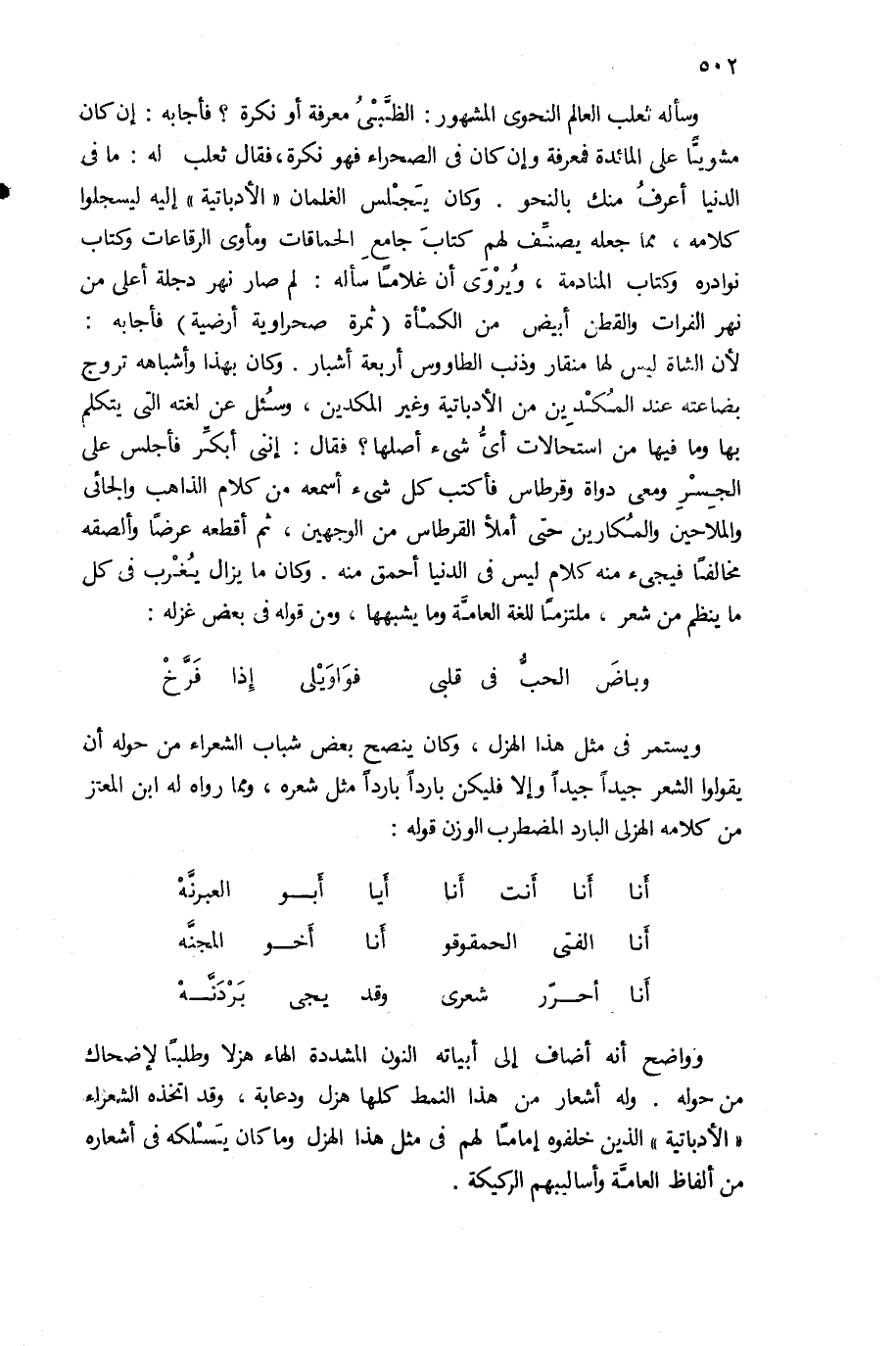 لأن الشاة ليس لها منقار وذنب الطاووس أربعة أشبار. وكان بهذا وأشباهه تروج بضاعته عند المكدين من الأدباتية وغير المكدين، وسئل عن لغته التى يتكلم بها وما فيها من استحالات أىّ شئ أصلها؟ فقال: إننى أبكّر فأجلس على الجسر ومعى دواة وقرطاس فأكتب كل شئ أسمعه من كلام الذاهب والجائى والملاحين والمكارين حتى أملأ القرطاس من الوجهين، ثم أقطعه عرضا وألصقه مخالفا فيجئ منه كلام ليس فى الدنيا أحمق منه. وكان ما يزال يغرب فى كل ما ينظم من شعر، ملتزما للغة العامّة وما يشبهها، ومن قوله فى بعض غزله:
