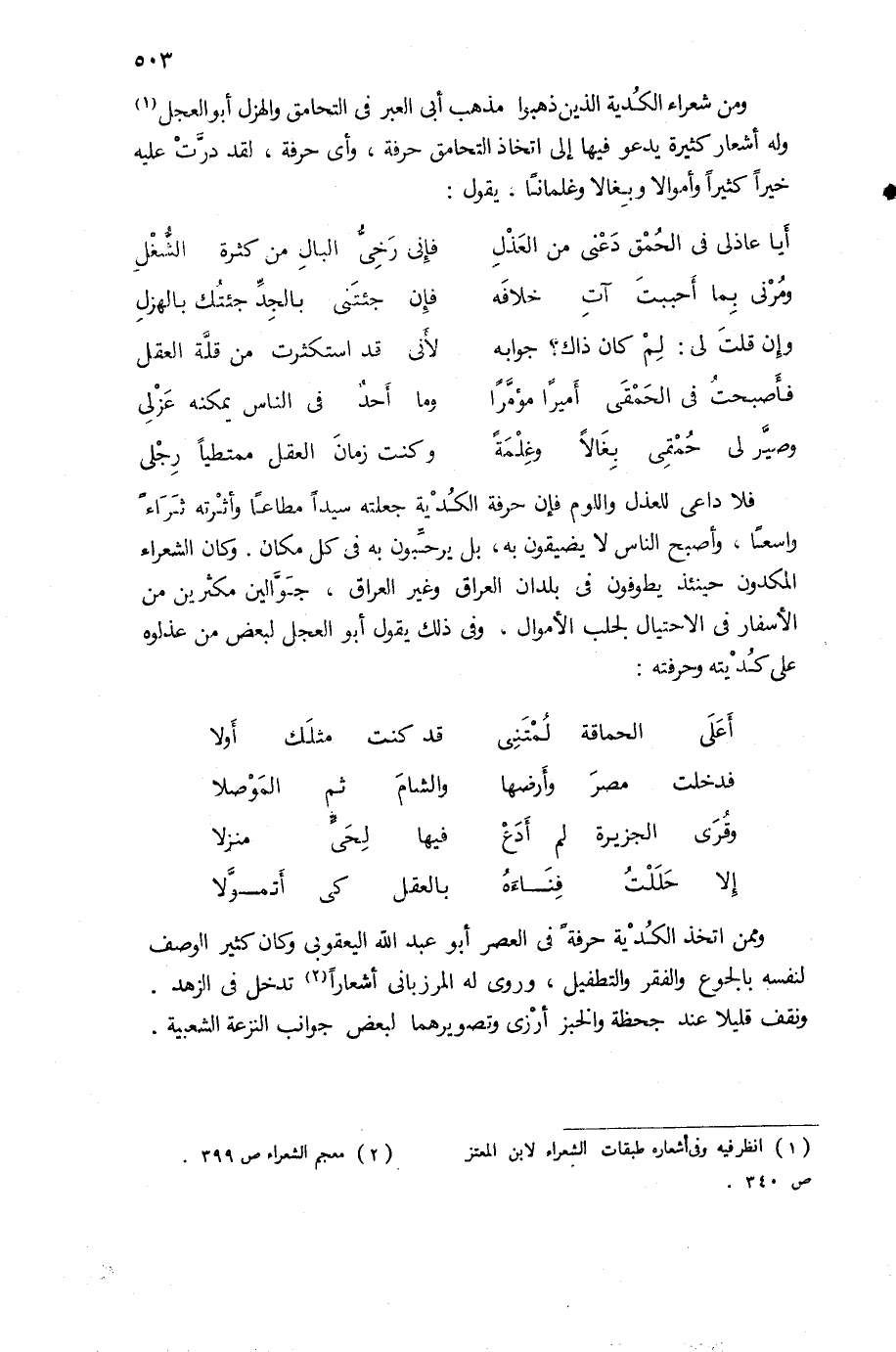 فلا داعى للعذل واللوم فإن حرفة الكدية جعلته سيدا مطاعا وأثرته ثراء واسعا، وأصبح الناس لا يضيقون به، بل يرحّبون به فى كل مكان. وكان الشعراء المكدون حينئذ يطوفون فى بلدان العراق وغير العراق، جوّالين مكثرين من الأسفار فى الاحتيال لجلب الأموال، وفى ذلك يقول أبو العجل لبعض من عذلوه على كديته وحرفته: