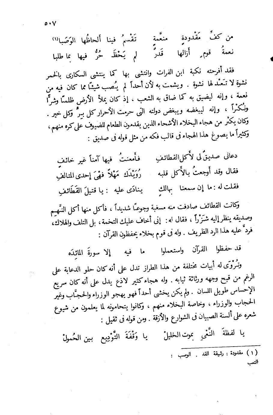 وكانت القطائف صادفت منه مسغبة وجوعا شديدا، فأكل منها أكل النّهم وصديقه ينظر إليه شزرا، فقال له: إنى أخاف عليك التخمة، بل التلف والهلاك، فردّ عليه هذا الرد الظريف. وله فى قوم بخلاء يحفظون القرآن: