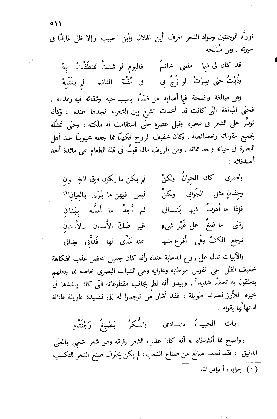 فحتى المبالغة التى كانت قد أخذت تشيع بين الشعراء نجدها عنده، وكأنه توفّر على الشعر فى عصره وقبل عصره حتى استقامت له ملكته، وحتى تمثّله بجميع مقوماته وخصائصه. وكان خفيف الروح فكها مما جعله محبوبا عند أهل البصرة فى حياته وبعد مماته. ومن طريف ماله قوله فى قلة الطعام على مائدة أحد أصدقائه: