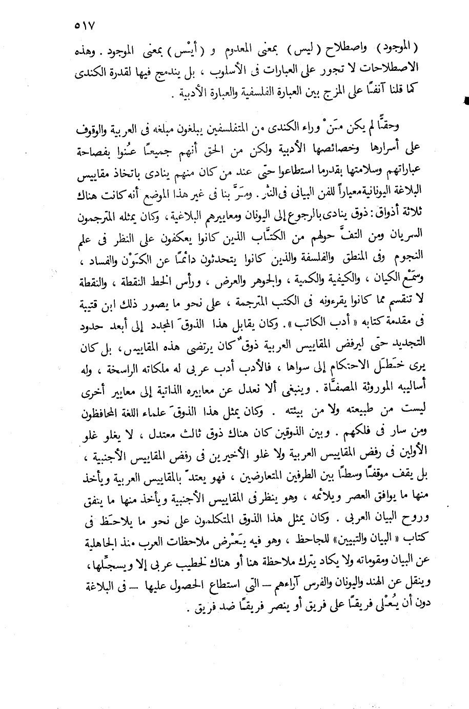 وحقّا لم يكن من وراء الكندى من المتفلسفين يبلغون مبلغه فى العربية والوقوف على أسرارها وخصائصها الأدبية ولكن من الحق أنهم جميعا عنوا بفصاحة عباراتهم وسلامتها بقدر ما استطاعوا حتى عند من كان منهم ينادى باتخاذ مقاييس البلاغة اليونانية معيارا للفن البيانى فى النثر. ومرّ بنا فى غير هذا الموضع أنه كانت هناك ثلاثة أذواق: ذوق ينادى بالرجوع إلى اليونان ومعاييرهم البلاغية، وكان يمثله المترجمون السريان ومن التفّ حولهم من الكتّاب الذين كانوا يعكفون على النظر فى علم النجوم وفى المنطق والفلسفة والذين كانوا يتحدثون دائما عن الكون والفساد، وسمع الكيان، والكيفية والكمية، والجوهر والعرض، ورأس الخط النقطة، والنقطة لا تنقسم مما كانوا يقرءونه فى الكتب المترجمة، على نحو ما يصور ذلك ابن قتيبة فى مقدمة كتابه «أدب الكاتب». وكان يقابل هذا الذوق المجدد إلى أبعد حدود التجديد حتى ليرفض المقاييس العربية ذوق كان يرتضى هذه المقاييس، بل كان يرى خطل الاحتكام إلى سواها، فالأدب أدب عربى له ملكاته الراسخة، وله أساليبه الموروثة المصفّاة. وينبغى ألا نعدل عن معاييره الذاتية إلى معايير أخرى ليست من طبيعته ولا من بيئته. وكان يمثل هذا الذوق علماء اللغة المحافظون ومن سار فى فلكهم. وبين الذوقين كان هناك ذوق ثالث معتدل، لا يغلو غلو الأولين فى رفض المقاييس العربية ولا غلو الأخيرين فى رفض المقاييس الأجنبية، بل يقف موقفا وسطا بين الطرفين المتعارضين، فهو يعتدّ بالمقاييس العربية ويأخذ منها ما يوافق العصر ويلائمه، وهو ينظر فى المقاييس الأجنبية ويأخذ منها ما يتفق وروح البيان العربى. وكان يمثل هذا الذوق المتكلمون على نحو ما يلاحظ فى كتاب «البيان والتبيين» للجاحظ، وهو فيه يعرض ملاحظات العرب منذ الجاهلية عن البيان ومقوماته ولا يكاد يترك ملاحظة هنا أو هناك لخطيب عربى إلا ويسجّلها، وينقل عن الهند واليونان والفرس آراءهم-التى استطاع الحصول عليها-فى البلاغة دون أن يعلى فريقا على فريق أو ينصر فريقا ضد فريق.