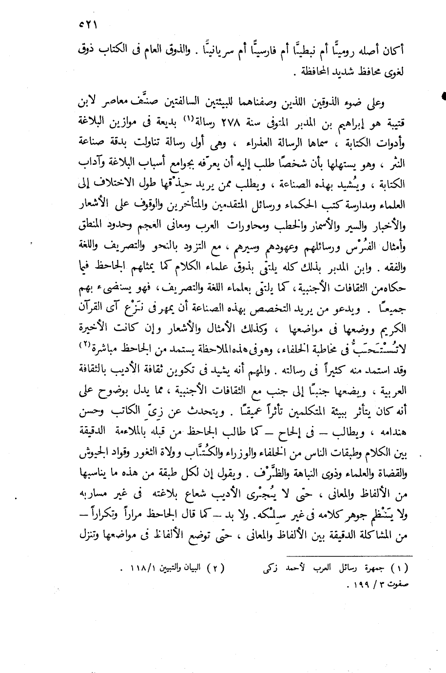 وعلى ضوء الذوقين اللذين وصفناهما للبيئتين السالفتين صنّف معاصر لابن قتيبة هو إبراهيم بن المدبر المتوفى سنة 278 رسالة (¬1) بديعة فى موازين البلاغة وأدوات الكتابة، سماها الرسالة العذراء، وهى أول رسالة تناولت بدقة صناعة النثر، وهو يستهلها بأن شخصا طلب إليه أن يعرّفه بجوامع أسباب البلاغة وآداب الكتابة، ويشيد بهذه الصناعة، ويطلب ممن يريد حذقها طول الاختلاف إلى العلماء ومدارسة كتب الحكماء ورسائل المتقدمين والمتأخرين والوقوف على الأشعار والأخبار والسير والأسمار والخطب ومحاورات العرب ومعانى العجم وحدود المنطق وأمثال الفرس ورسائلهم وعهودهم وسيرهم، مع التزود بالنحو والتصريف واللغة والفقه. وابن المدبر بذلك كله يلتقى بذوق علماء الكلام كما يمثلهم الجاحظ فيما حكاه من الثقافات الأجنبية، كما يلتقى بعلماء اللغة والتصريف، فهو يستضئ بهم جميعا. ويدعو من يريد التخصص بهذه الصناعة أن يمهر فى نزع آى القرآن الكريم ووضعها فى مواضعها، وكذلك الأمثال والأشعار وإن كانت الأخيرة لا تستحبّ فى مخاطبة الخلفاء، وهو فى هذه الملاحظة يستمد من الجاحظ مباشرة (¬2) وقد استمد منه كثيرا فى رسالته. والمهم أنه يشيد فى تكوين ثقافة الأديب بالثقافة العربية، ويضعها جنبا إلى جنب مع الثقافات الأجنبية، مما يدل بوضوح على أنه كان يتأثر ببيئة المتكلمين تأثرا عميقا. ويتحدث عن زىّ الكاتب وحسن هندامه، ويطالب-فى إلحاح-كما طالب الجاحظ من قبله بالملاءمة الدقيقة بين الكلام وطبقات الناس من الخلفاء والوزراء والكتّاب وولاة الثغور وقواد الجيوش والقضاة والعلماء وذوى النباهة والظّرف. ويقول إن لكل طبقة من هذه ما يناسبها من الألفاظ والمعانى، حتى لا يجرى الأديب شعاع بلاغته فى غير مساربه ولا ينظم جوهر كلامه فى غير سلكه. ولا بد-كما قال الجاحظ مرارا وتكرارا- من المشاكلة الدقيقة بين الألفاظ والمعانى، حتى توضع الألفاظ فى مواضعها وتنزل