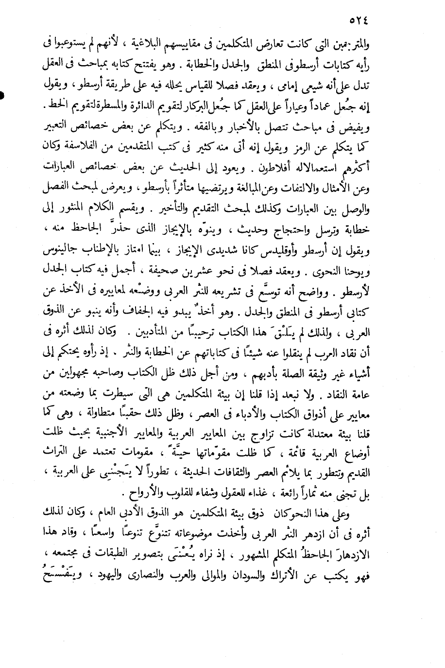 ويفيض فى مباحث تتصل بالأخبار وبالفقه. ويتكلم عن بعض خصائص التعبير كما يتكلم عن الرمز ويقول إنه أتى منه كثير فى كتب المتقدمين من الفلاسفة وكان أكثرهم استعمالا له أفلاطون. ويعود إلى الحديث عن بعض خصائص العبارات وعن الأمثال والالتفات وعن المبالغة ويرتضيها متأثرا بأرسطو. ويعرض لمبحث الفصل والوصل بين العبارات وكذلك لمبحث التقديم والتأخير. ويقسم الكلام المنثور إلى خطابة وترسل واحتجاج وحديث، وينوّه بالإيجاز الذى حذّر الجاحظ منه، ويقول إن أرسطو وأوقليدس كانا شديدى الإيجاز، بينما امتاز بالإطناب جالينوس ويوحنا النحوى. ويعقد فصلا فى نحو عشرين صحيفة، أجمل فيه كتاب الجدل لأرسطو. وواضح أنه توسّع فى تشريعه للنثر العربى ووضعه لمعاييره فى الأخذ عن كتابى أرسطو فى المنطق والجدل. وهو أخذ يبدو فيه الجفاف وأنه ينبو عن الذوق العربى، ولذلك لم يلق هذا الكتاب ترحيبا من المتأدبين. وكان لذلك أثره فى أن نقاد العرب لم ينقلوا عنه شيئا فى كتاباتهم عن الخطابة والنثر، إذ رأوه يحتكم إلى أشياء غير وثيقة الصلة بأدبهم، ومن أجل ذلك ظل الكتاب وصاحبه مجهولين من عامة النقاد. ولا نبعد إذا قلنا إن بيئة المتكلمين هى التى سيطرت بما وضعته من معايير على أذواق الكتاب والأدباء فى العصر، وظل ذلك حقبا متطاولة، وهى كما قلنا بيئة معتدلة كانت تزاوج بين المعايير العربية والمعايير الأجنبية بحيث ظلت أوضاع العربية قائمة، كما ظلت مقوّماتها حيّة، مقومات تعتمد على التراث القديم وتتطور بما يلاثم العصر والثقافات الحديثة، تطورا لا يجنى على العربية، بل تجنى منه ثمارا رائعة، غذاء للعقول وشفاء للقلوب والأرواح.