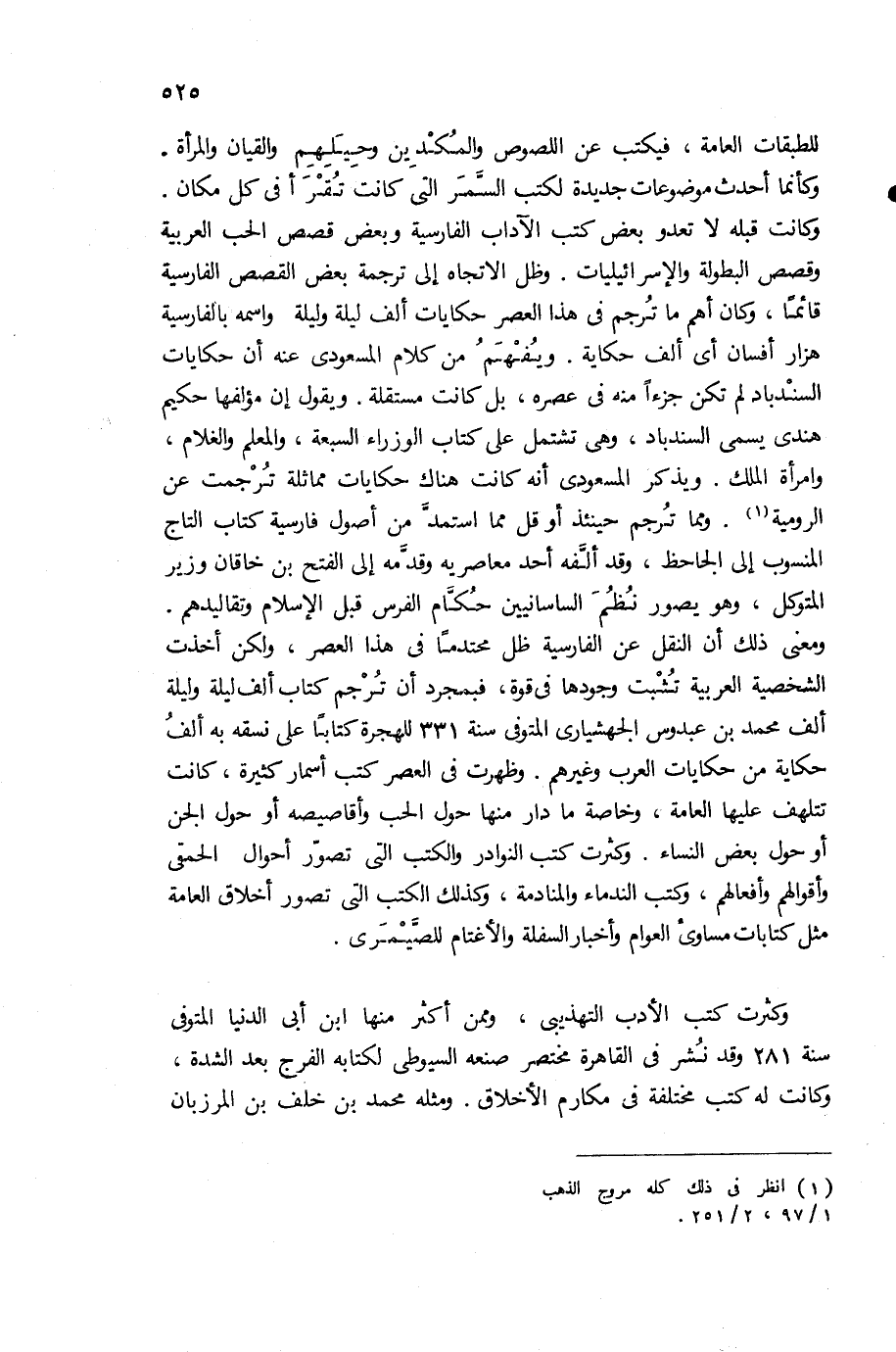 وكانت قبله لا تعدو بعض كتب الآداب الفارسية وبعض قصص الحب العربية وقصص البطولة والإسرائيليات. وظل الاتجاه إلى ترجمة بعض القصص الفارسية قائما، وكان أهم ما ترجم فى هذا العصر حكايات ألف ليلة وليلة واسمه بالفارسية هزار أفسان أى ألف حكاية. ويفهم من كلام المسعودى عنه أن حكايات السندباد لم تكن جزءا منه فى عصره، بل كانت مستقلة. ويقول إن مؤلفها حكيم هندى يسمى السندباد، وهى تشتمل على كتاب الوزراء السبعة، والمعلم والغلام، وامرأة الملك. ويذكر المسعودى أنه كانت هناك حكايات مماثلة ترجمت عن الرومية (¬1). ومما ترجم حينئذ أو قل مما استمدّ من أصول فارسية كتاب التاج المنسوب إلى الجاحظ، وقد ألّفه أحد معاصريه وقدّمه إلى الفتح بن خاقان وزير المتوكل، وهو يصور نظم الساسانيين حكّام الفرس قبل الإسلام وتقاليدهم.
