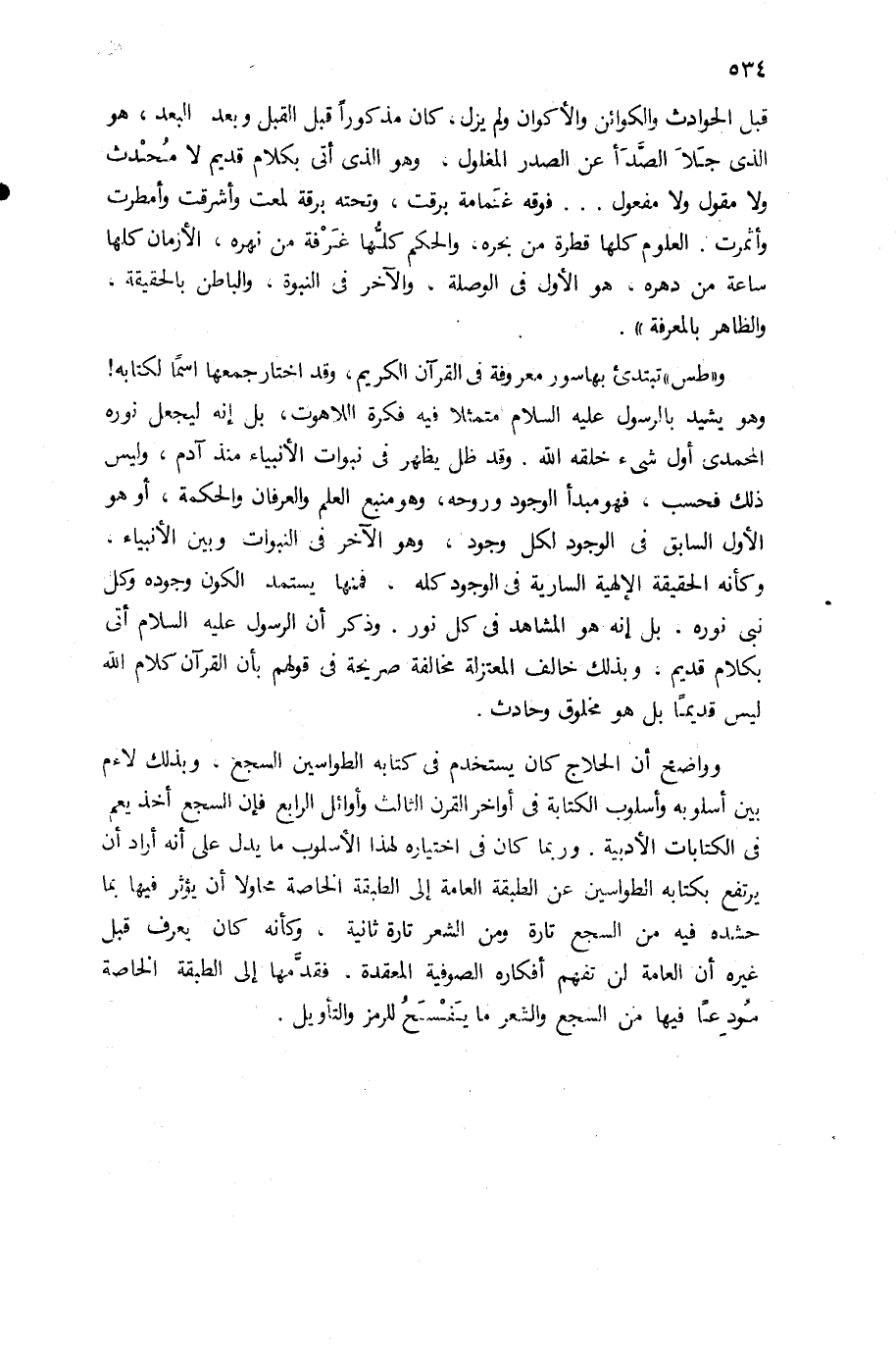 وكأنه الحقيقة الإلهية السارية فى الوجود كله. فمنها يستمد الكون وجوده وكل نبى نوره. بل إنه هو المشاهد فى كل نور. وذكر أن الرسول عليه السلام أتى بكلام قديم، وبذلك خالف المعتزلة مخالفة صريحة فى قولهم بأن القرآن كلام الله ليس قديما بل هو مخلوق وحادث.