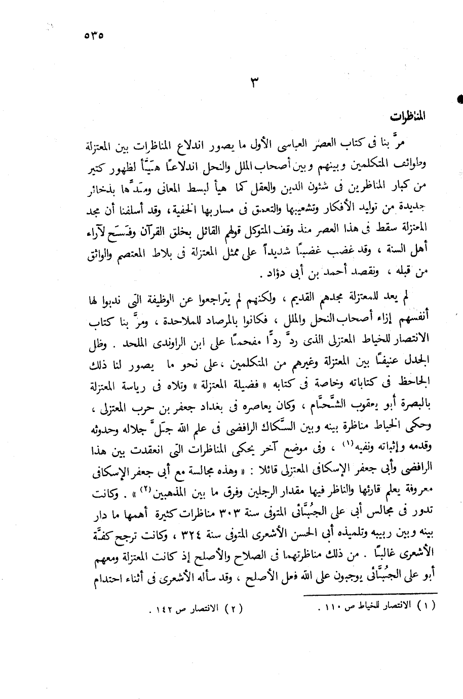 مرّ بنا فى كتاب العصر العباسى الأول ما يصور اندلاع المناظرات بين المعتزلة وطوائف المتكلمين وبينهم وبين أصحاب الملل والنحل اندلاعا هيّأ لظهور كثير من كبار المناظرين فى شئون الدين والعقل كما هيأ لبسط المعانى ومدّها بذخائر جديدة من توليد الأفكار وتشعيبها والتعمق فى مساربها الخفية، وقد أسلفنا أن مجد المعتزلة سقط فى هذا العصر منذ وقف المتوكل قولهم القائل بخلق القرآن وفسح لآراء أهل السنة، وقد عضب غضبا شديدا على ممثل المعتزلة فى بلاط المعتصم والواثق من قبله، ونقصد أحمد بن أبى دؤاد.