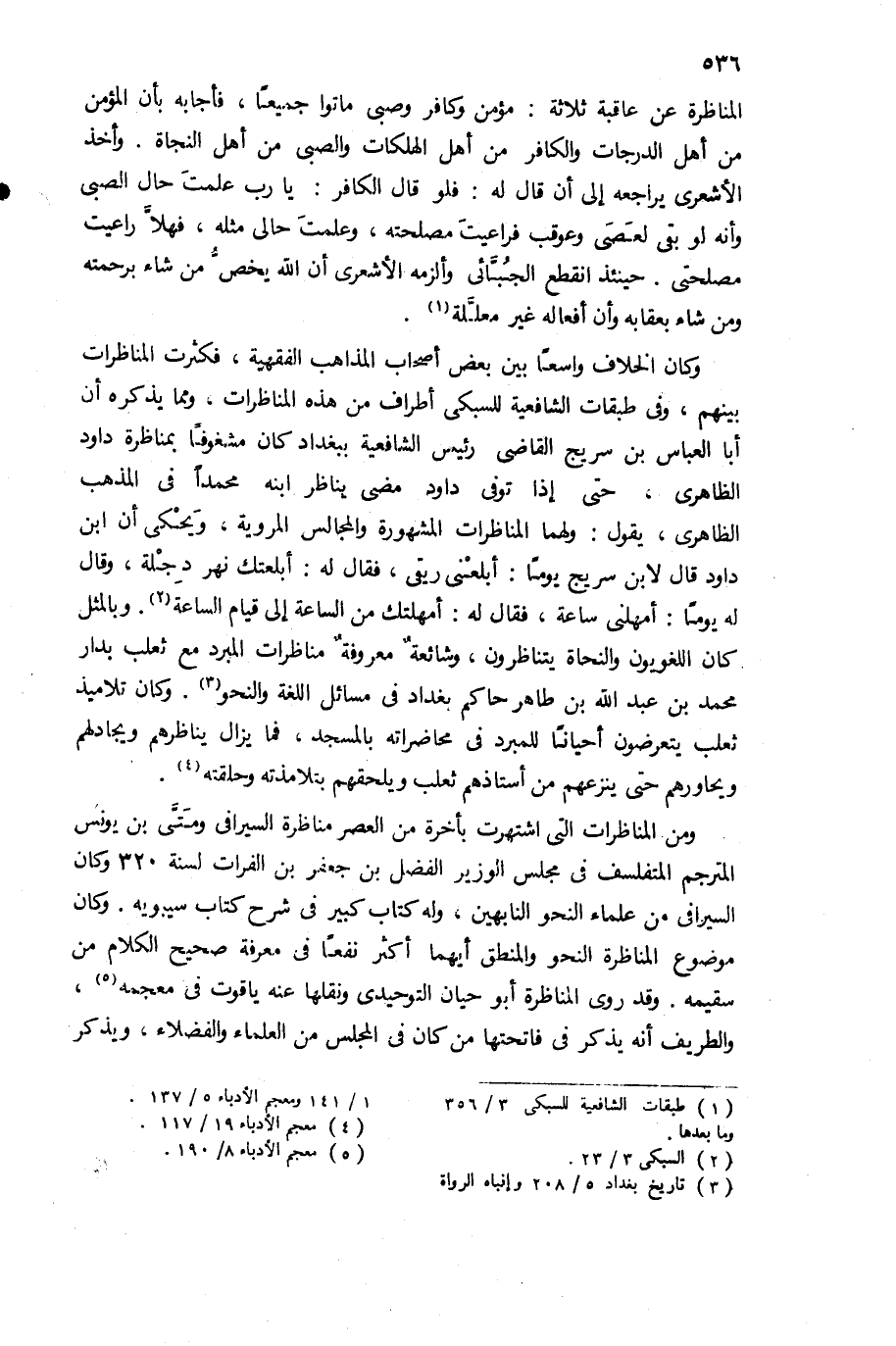 ومن المناظرات التى اشتهرت بأخرة من العصر مناظرة السيرافى ومتّى بن يونس المترجم المتفلسف فى مجلس الوزير الفضل بن جعفر بن الفرات لسنة 320 وكان السيرافى من علماء النحو النابهين، وله كتاب كبير فى شرح كتاب سيبويه. وكان موضوع المناظرة النحو والمنطق أيهما أكثر نفعا فى معرفة صحيح الكلام من سقيمه. وقد روى المناظرة أبو حيان التوحيدى ونقلها عنه ياقوت فى معجمه (¬5)، والطريف أنه يذكر فى فاتحتها من كان فى المجلس من العلماء والفضلاء، ويذكر