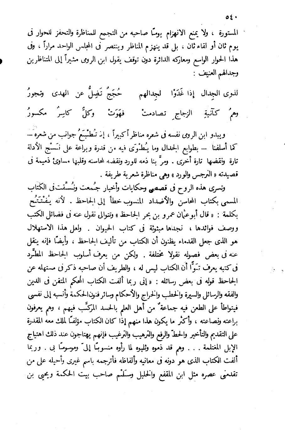 ويبدو ابن الرومى نفسه فى شعره مناظرا كبيرا، إذ تطبع جوانب من شعره كما أسلفنا-بطوابع الجدال وما يطوى فيه من قدرة وبراعة على نسج الأدلة تارة ونقضها تارة أخرى. ومرّ بنا ذمه للورد ونقضه محاسنه وقلبها مساوئ ذميمة فى قصيدته «النرجس والورد» وهى مناظرة شعرية طريفة.