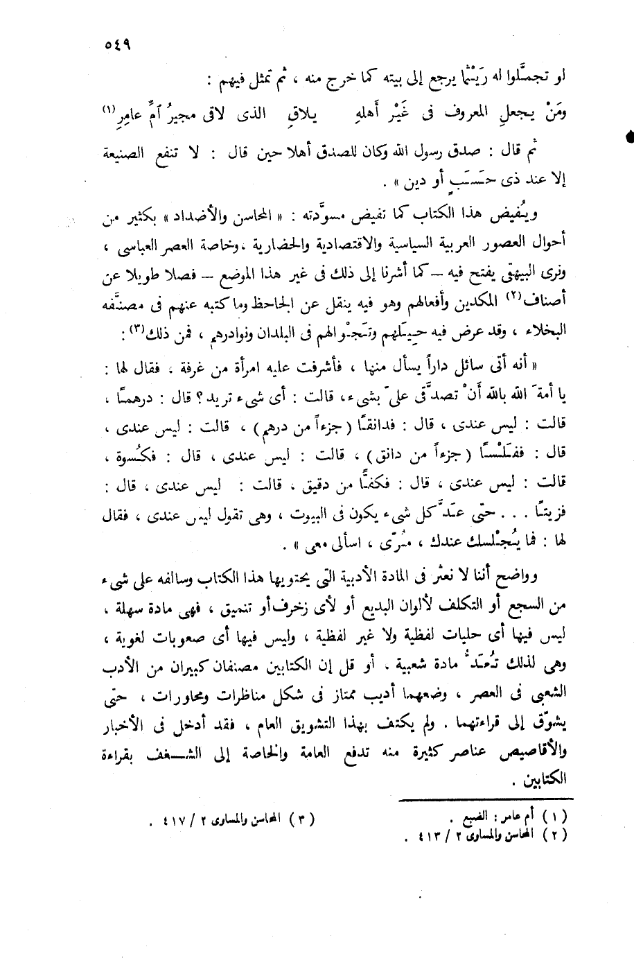 ويفيض هذا الكتاب كما تفيض مسوّدته: «المحاسن والأضداد» بكثير من أحوال العصور العربية السياسية والاقتصادية والحضارية، وخاصة العصر العباسى، ونرى البيهقى يفتح فيه-كما أشرنا إلى ذلك فى غير هذا الموضع-فصلا طويلا عن أصناف (¬2) المكدين وأفعالهم وهو فيه ينقل عن الجاحظ وما كتبه عنهم فى مصنّفه البخلاء، وقد عرض فيه حيلهم وتجوالهم فى البلدان ونوادرهم، فمن ذلك (¬3):
