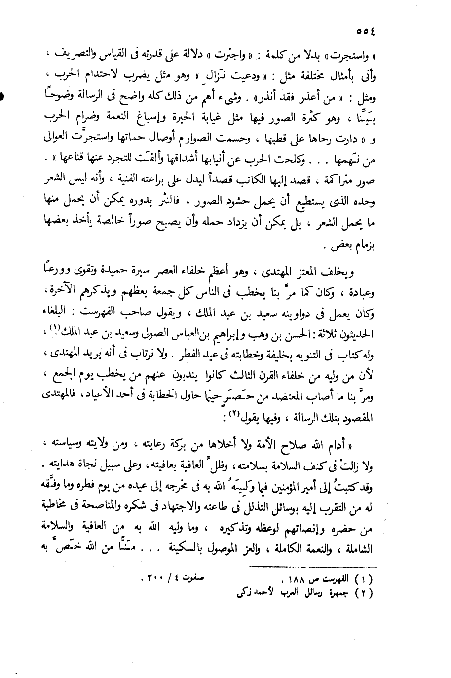 وكان يعمل فى دواوينه سعيد بن عبد الملك، ويقول صاحب الفهرست: البلغاء الحديثون ثلاثة: الحسن بن وهب وإبراهيم بن العباس الصولى وسعيد بن عبد الملك (¬1)، وله كتاب فى التنويه بخليفة وخطابته فى عيد الفطر. ولا نرتاب فى أنه يريد المهتدى، لأن من وليه من خلفاء القرن الثالث كانوا يندبون عنهم من يخطب يوم الجمع، ومرّ بنا ما أصاب المعتضد من حصر حينما حاول الخطابة فى أحد الأعياد، فالمهتدى المقصود بتلك الرسالة، وفيها يقول (¬2):
