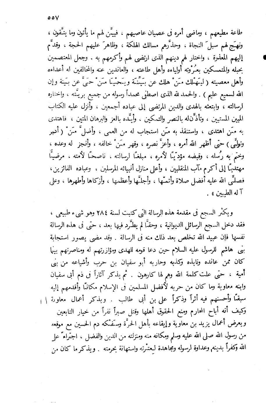 ويكثر السجع فى مقدمة هذه الرسالة التى كتبت لسنة 284 وهو شئ طبيعى، فقد دخل السجع الرسائل الديوانية، وحقّا لم يطّرد فيها بعد، حتى فى هذه الرسالة نفسها فإن عبيد الله تخلص بعد ذلك منه فى الرسالة. وقد مضى يصور استجابة بنى هاشم للرسول عليه السلام حين دعا قومه للهدى ومؤازرتهم له ومناصرتهم بينما كان ممن عانده ونابذه وكذبه وحاربه أبو سفيان بن حرب وأشياعه من بنى أمية، حتى علت كلمة الله وهم لها كارهون. ثم يذكر آثارا فى ذم أبى سفيان وابنه معاوية وما كان من حربه لأفضل المسلمين فى الإسلام مكانا وأقدمهم إليه سبقا وأحسنهم فيه أثرا وذكرا على بن أبى طالب. ويذكر أعمال معاوية وكيف أنه أباح المحارم ومنع الحقوق أهلها وقتل صبرا نفرا من خيار التابعين ويعرض أعمال يزيد بن معاوية وإيقاعه بأهل الحرّة وسفكه دم الحسين مع موقعه من رسول الله صلى الله عليه وسلم ومكانه منه ومنزلته من الدين والفضل، اجتراء على الله وكفرا بدينه وعداوة لرسوله ومجاهدة لعترته واستهانة بحرمته. ويذكر ما كان من