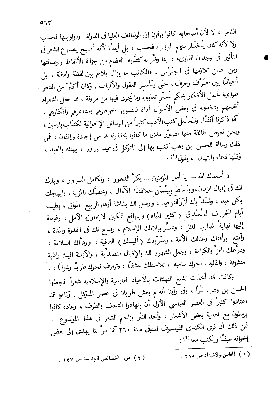 الشعر، لا لأن أصحابه كانوا يرقون إلى الوظائف العليا فى الدولة ودواوينها فحسب ولا لأنه كان يختار منهم الوزراء فحسب، بل أيضا لأنه أصبح يضارع الشعر فى التأثير فى وجدان القارئ، بما وفّر له كتّابه العظام من جزالة الألفاظ ورصانتها ومن حسن تلاؤمها فى الجرس. فالكاتب ما يزال يلائم بين لفظة ولفظة، بل أحيانا بين حرف وحرف، حتى يأسر العقول والألباب. وكان أكثر من الشعر طواعية لحمل الأفكار بحكم يسر تعابيره وما يجرى فيها من مرونة، مما جعل الشعراء أنفسهم يتخذونه فى بعض الأحوال أداة لتصوير خواطرهم ومشاعرهم وأفكارهم، كما ذكرنا آنفا. وتحمل كتب الأدب كثيرا من الرسائل الإخوانية لكتّاب بارعين، ونحن نعرض طائفة منها تصوّر مدى ما كانوا يحققونه لها من إجادة وإتقان، فمن ذلك رسالة للحسن بن وهب كتب بها إلى المتوكل فى عيد نيروز، يهنئه بالعيد، وكلها دعاء وابتهال، يقول (¬1):