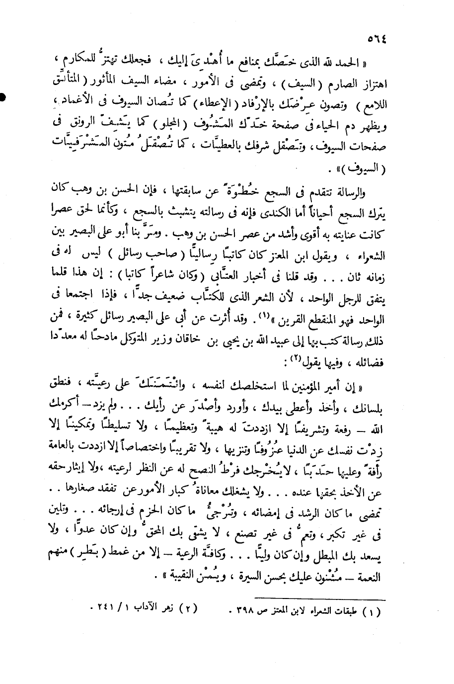 «الحمد لله الذى خصّك بمنافع ما أهدى إليك، فجعلك تهتزّ للمكارم، اهتزاز الصارم (السيف)، وتمضى فى الأمور، مضاء السيف المأثور (المتألّق اللامع) وتصون عرضك بالإرفاد (الإعطاء) كما تصان السيوف فى الأغماد، ويظهر دم الحياء فى صفحة خدّك المشوف (المجلو) كما يشفّ الرونق فى صفحات السيوف، وتصقل شرفك بالعطيّات، كما تصقل متون المشرفيّات (السيوف)».