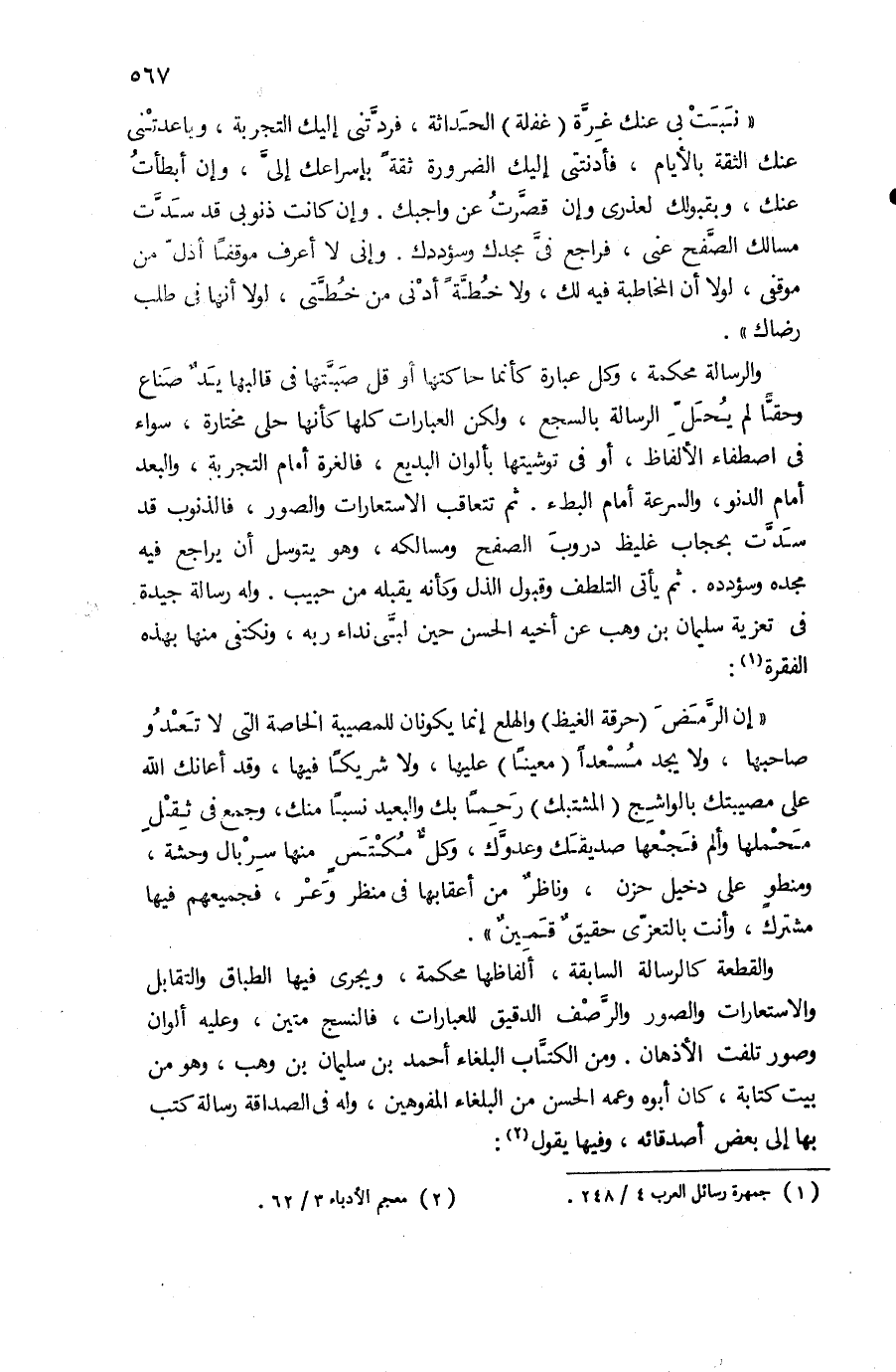 والرسالة محكمة، وكل عبارة كأنما حاكتها أو قل صبّتها فى قالبها يد صناع وحقّا لم يحلّ الرسالة بالسجع، ولكن العبارات كلها كأنها حلى مختارة، سواء فى اصطفاء الألفاظ، أو فى توشيئها بألوان البديع، فالغرة أمام التجربة، والبعد أمام الدنو، والسرعة أمام البطء. ثم تتعاقب الاستعارات والصور، فالذنوب قد سدّت بحجاب غليظ دروب الصفح وممالكه، وهو يتوسل أن يراجع فيه مجده وسؤدده. ثم يأتى التلطف وقبول الذل وكأنه يقبله من حبيب. وله رسالة جيدة فى تعزية سليمان بن وهب عن أخيه الحسن حين لبّى نداء ربه، ونكتفى منها بهذه الفقرة (¬1):