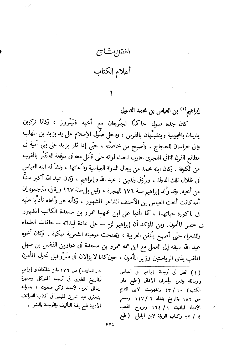 (¬1) انظر فى ترجمة إبراهيم بن العباس ورسائله وشعره وأخباره الأغانى (طبع دار الكتب) 10/ 43 والفهرست لابن النديم ص 182 وتاريخ بغداد 6/ 117 ومعجم الأدباء لياقوت 1/ 164 ومروج الذهب 4/ 23 وكتاب الورقة لابن الجراح (طبع دار المعارف) ص 136 وابن خلكان فى إبراهيم وتاريخ الطبرى فى ترجمة المتوكل وجمهرة رسائل العرب لأحمد زكى صفوت، وديوانه بتحقيق عبد العزيز الميمنى فى كتاب الطرائف الأدبية طبع لجنة التأليف والترجمة والنشر.