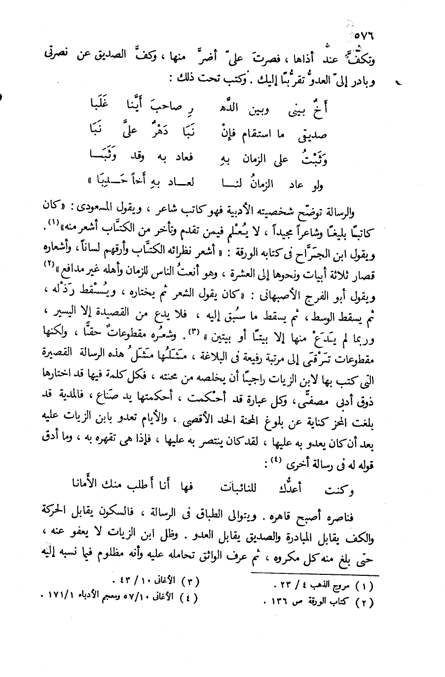 ويقول ابن الجرّاح فى كتابه الورقة: «أشعر نظرائه الكتّاب وأرقهم لسانا، وأشعاره قصار ثلاثة أبيات ونحوها إلى العشرة، وهو أنعت الناس للزمان وأهله غير مدافع» (¬2) ويقول أبو الفرج الأصبهانى: «كان يقول الشعر ثم يختاره، ويسقط رذله، ثم يسقط الوسط، ثم يسقط ما سبق إليه، فلا يدع من القصيدة إلا اليسير، وربما لم يدع منها إلا بيتا أو بيتين» (¬3). وشعره مقطوعات حقّا، ولكنها مقطوعات ترقى إلى مرتبة رفيعة فى البلاغة، مثلها مثل هذه الرسالة القصيرة التى كتب بها لابن الزيات راجيا أن يخلصه من محنته، فكل كلمة فيها قد اختارها ذوق أدبى مصفّى، وكل عبارة قد أحكمت، أحكمتها يد صناع، فالمدية قد بلغت المحز كناية عن بلوغ المحنة الحد الأقصى، والأيام تعدو بابن الزيات عليه بعد أن كان يعدو به عليها، لقد كان ينتصر به عليها، فإذا هى تقهره به، وما أدق قوله له فى رسالة أخرى (¬4):