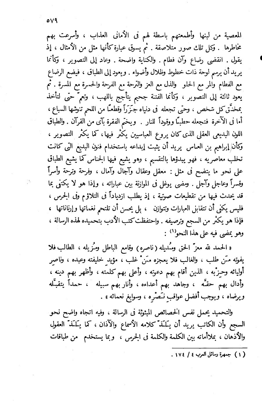 المعصية من لبنها وأطمعتهم باسطة لهم فى الأمانى العذاب، وأسرعت بهم مخاطرها. وكل تلك صور متلاصقة. ثم يسوق عبارة كأنها مثل من الأمثال، إذ يقول. انقضى رضاع وآن فطام. والكناية واضحة. وعاد إلى التصوير، وكأنما يريد أن يرسم لوحة ذات خطوط وظلال وأضواء. ويعود إلى الطباق، فيضع الرضاع مع الفطام والمر مع الحلو والذل مع العز والترحة مع الفرحة والحسرة مع المسرة. ثم يعود ثالثة إلى التصوير، وكأنما الفتنة جحيم يتأجج باللهب، وتعمّ حتى لتأخذ بمخنّق كل شخص، وحتى تجعله فى دنياه جزرا وقطعا من اللحم تنوشها السباع، أما فى الآخرة فتجعله حطبا ووقودا للنار. ويختم الفقرة بآى من القرآن. والطباق اللون البديعى العقلى الذى كان يروع العباسيين يكثر فيها، كما يكثر التصوير، وكأن إبراهيم بن العباس يريد أن يثبت إبداعه باستخدام فنون البديع التى كانت تخلب معاصريه، فهو يبدؤها بالتقسيم، وهو يشيع فيها الجناس كما يشيع الطباق على نحو ما يتضح فى مثل: معقل وعقال وآجال وآمال، وفرحة وترحة وأسرا وقسرا وعاجل وآجل. ومضى يوغل فى الموازنة بين عباراته، وإذا هو لا يكتفى بما قد يحدث فيها من تقطيعات صوتية، إذ يطلب ازديادا فى التلاؤم وفى الجرس، فليس يكفى أن تتقابل العبارات وتتوازن، بل يحسن أن تلتحم نغماتها وإزناناتها، فإذا هو يكثر من السجع وترصيفه. واحتفظت كتب الأدب بتحميده لهذه الرسالة، وهو يمضى فيه على هذا النحو (¬1):